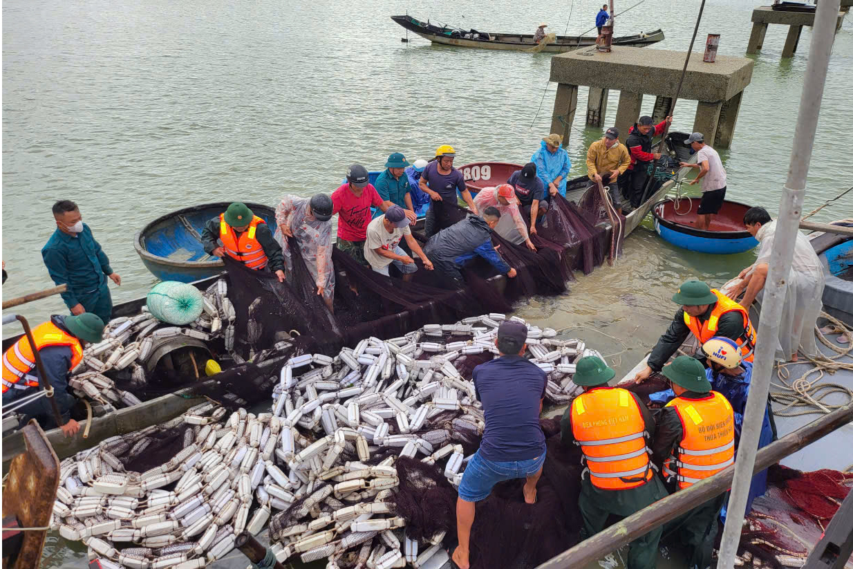 Tại khu vực phường Thuận An, Đồn Biên phòng cửa khẩu cảng Thuận An phối hợp với chính quyền địa phương, các lực lượng và bà con ngư dân trong Tổ tàu thuyền đoàn kết tổ chức trục vớt tàu cá TTH 96454 TS của ông Nguyễn Văn Tấn bị chìm tại âu thuyền tổ dân phố An Dương 2.
