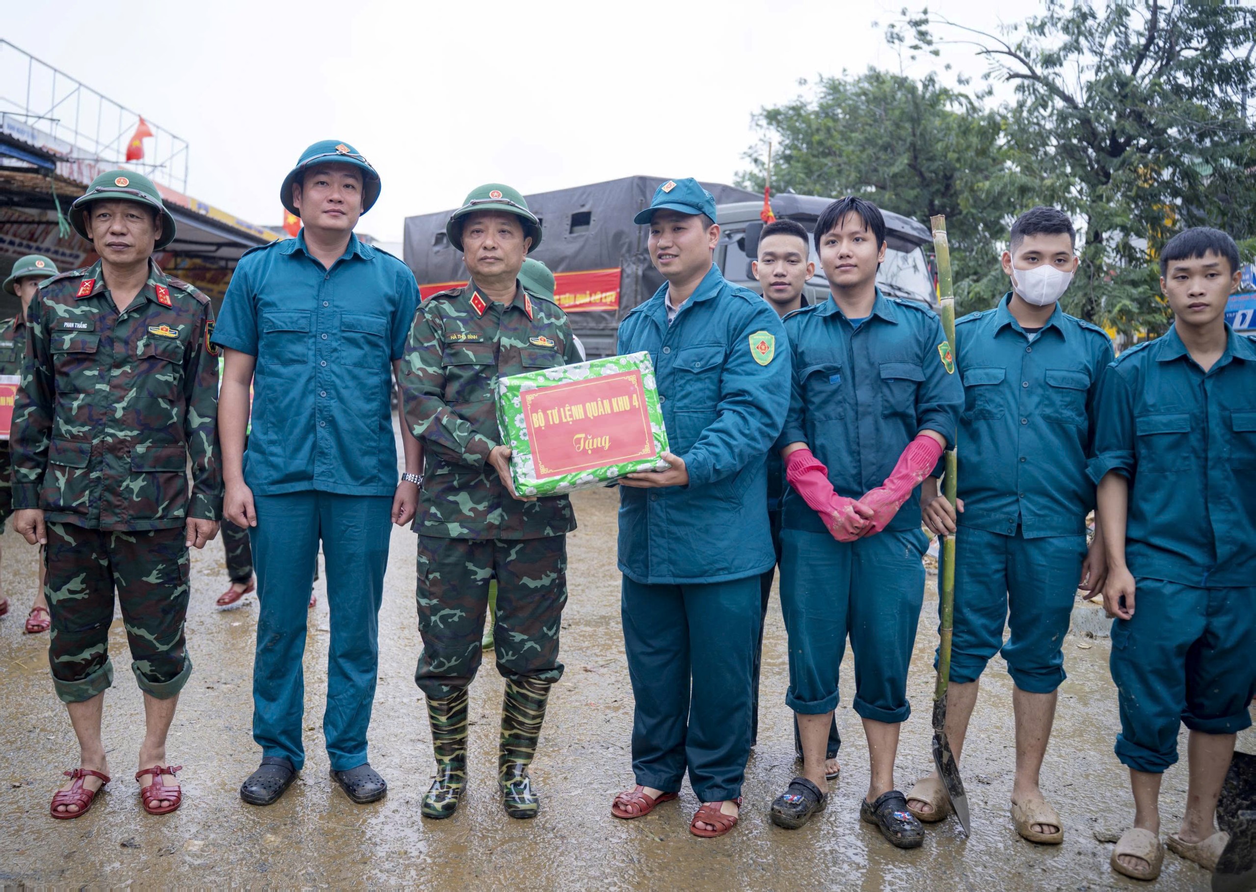 Trong ngày 4/11, Quân khu 4 đã huy động huy động hơn 7.000 cán bộ, chiến sĩ, dân quân thuộc Bộ CHQS thành phố Huế và Sư đoàn 968 cùng nhiều phương tiện, chia thành nhiều mũi cơ động đến các phường, xã, trường học, cơ sở y tế, chợ dân sinh… hỗ trợ nhân dân dọn dẹp, vệ sinh môi trường, thu gom rác thải, khử khuẩn và tu sửa cơ sở vật chất. Đoàn công tác đã đến kiểm tra, động viên cán bộ, chiến sĩ Sư đoàn 968 đang tham gia dọn bùn đất, rác thải tại Chợ Tây Lộc, Trường Mầm non Tây Lộc và Trạm Y tế phường Vĩ Dạ (Cơ sở 3), những điểm chịu ảnh hưởng nặng nề trong đợt mưa lũ vừa qua. Tại các điểm đến, Trung tướng Hà Thọ Bình, Tư lệnh Quân khu 4 đã ân cần thăm hỏi, biểu dương tinh thần khẩn trương, tận tụy và trách nhiệm cao của cán bộ, chiến sĩ lực lượng vũ trang thành phố Huế nói chung, Sư đoàn 968 và Bộ CHQS thành phố nói riêng. Mặc dù thời tiết còn diễn biến phức tạp, điều kiện vệ sinh môi trường khó khăn, song bộ đội vẫn luôn phát huy truyền thống “Bộ đội Cụ Hồ”, không quản ngại gian khổ, sát cánh cùng nhân dân khắc phục hậu quả, góp phần sớm đưa cuộc sống trở lại bình thường. Tư lệnh Quân khu 4 yêu cầu các đơn vị tiếp tục phát huy tinh thần "nước rút đến đâu, dọn sạch đến đó", chủ động phối hợp chặt chẽ với chính quyền và các lực lượng địa phương, rà soát các khu vực bị ngập sâu, tập trung nhân lực, phương tiện hỗ trợ nhân dân dọn bùn đất, thu gom rác thải, khử khuẩn các khu dân cư, trường học, trạm y tế; đồng thời giúp sửa chữa, vệ sinh trang thiết bị, bàn ghế, phòng học để học sinh sớm được trở lại trường, bảo đảm an toàn và sức khỏe cho người dân sau lũ.