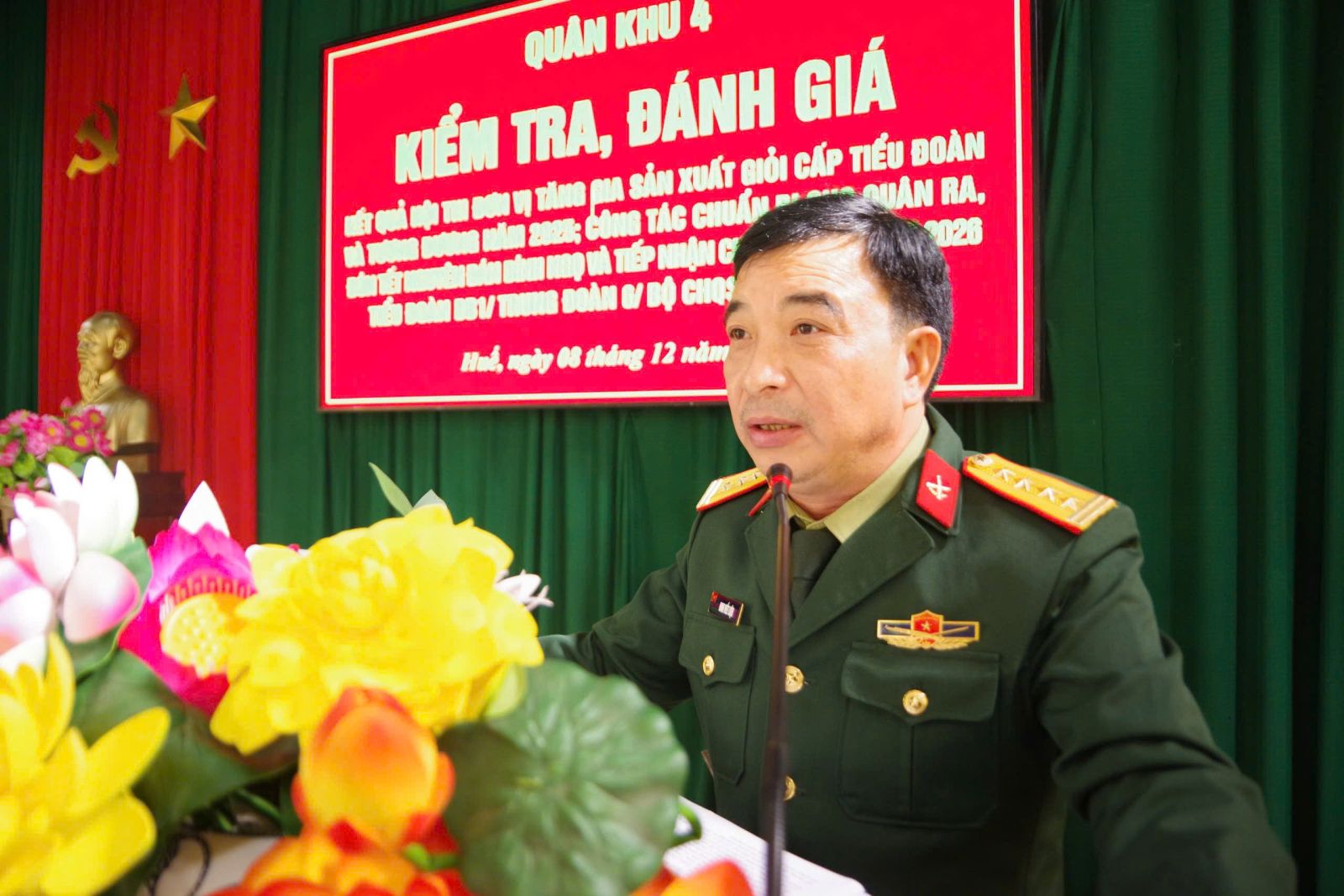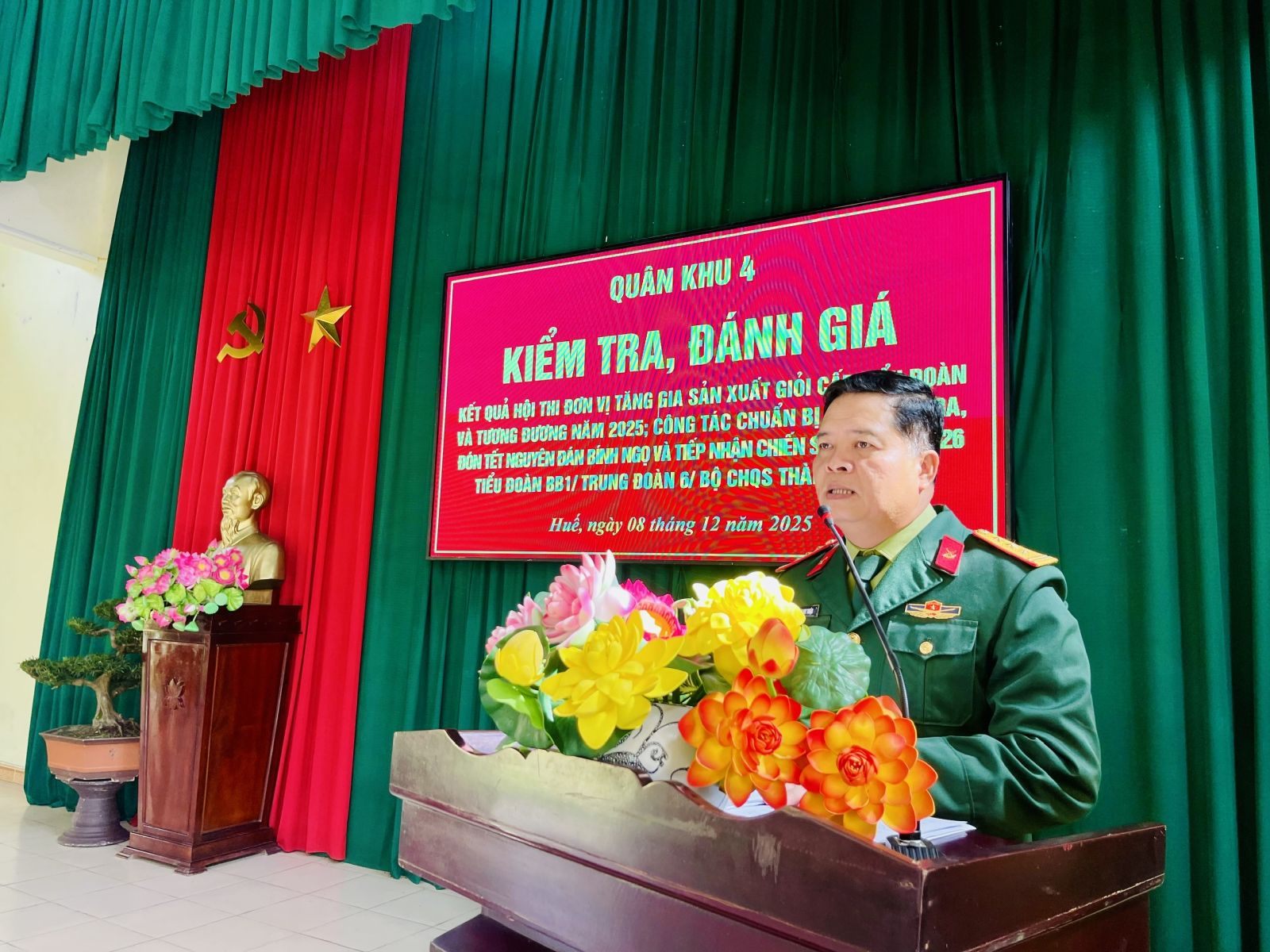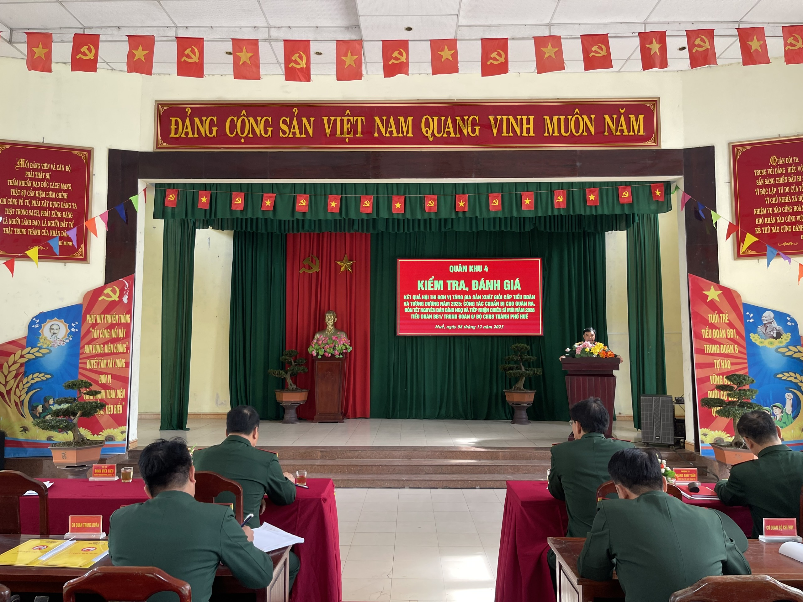 Sáng ngày 08/12, Đoàn công tác Quân khu 4 do Thượng tá Phan Duy Thuận, Phó Chủ nhiệm Hậu cần - Kỹ thuật Quân khu 4 làm Trưởng đoàn đã tiến hành kiểm tra, đánh giá kết quả Hội thi “Đơn vị tăng gia sản xuất giỏi" cấp tiểu đoàn và tương đương năm 2025; công tác chuẩn bị cho quân ra, đón tết nguyên đán Bính Ngọ và tiếp nhận chiến sĩ mới năm 2026 tại Tiểu đoàn bộ binh (BB)1, Trung đoàn 6. Cùng tham dự có đồng chí Đại tá Đinh Viết Liệu, Trưởng phòng Quân nhu, Cục Hậu cần - Kỹ thuật Quân khu 4, đồng chí Đại tá Nguyễn Đình Khoa, Phó Chỉ huy trưởng Bộ Chỉ huy Quân sự (CHQS) thành phố, Thủ trưởng Phòng Hậu cần - Kỹ thuật Bộ CHQS thành phố, Đảng uỷ - Chỉ huy Trung đoàn 6 và cán bộ, chiến sĩ Tiểu đoàn BB1.