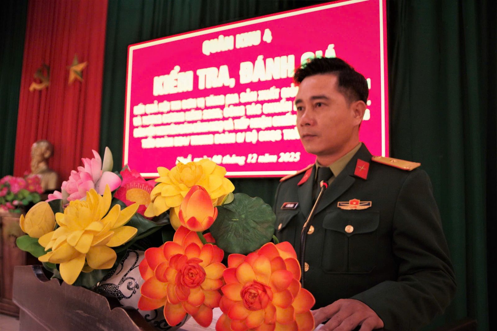 Đại tá Đinh Viết Liệu, Trưởng phòng Quân nhu, Cục Hậu cần - Kỹ thuật Quân khu 4 phát biểu tại buổi kiểm tra