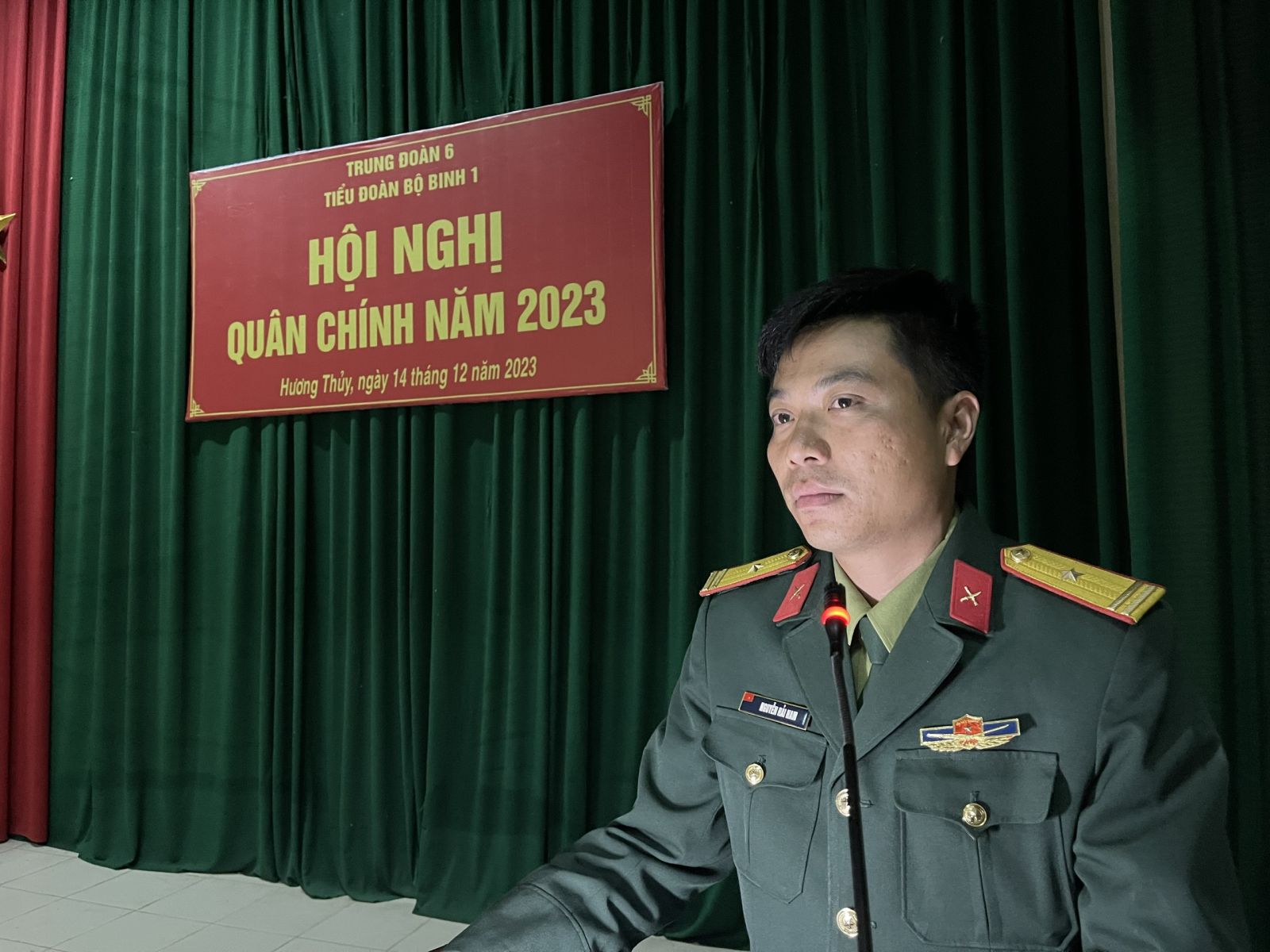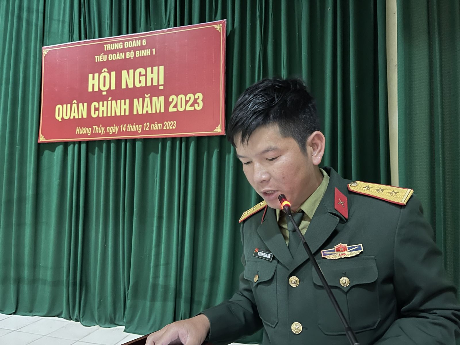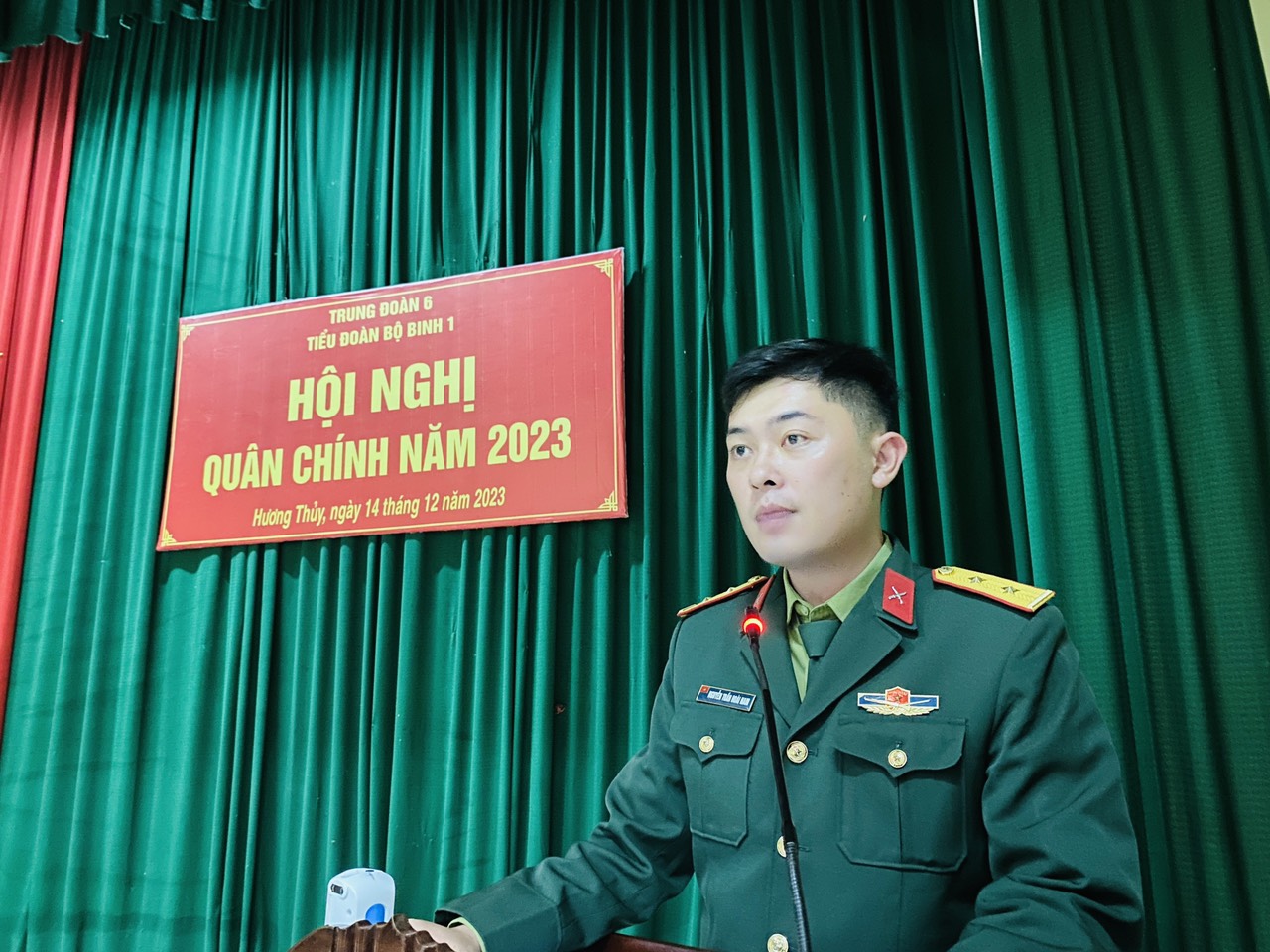 Phát biểu chỉ đạo tại Hội nghị, Thiếu tá Nguyễn Hải Nam – Phó Trung đoàn trưởng, Tham mưu trưởng Trung đoàn đã biểu dương những kết quả mà đơn vị đã đạt được trong năm 2023 đồng thời đề nghị trong thời gian tới Đảng uỷ, chỉ huy Tiểu đoàn tiếp tục triển khai thực hiện thắng lợi các nhiệm vụ được giao trong đó tập trung chú trọng duy trì nghiêm các chế độ trực sẵn sàng chiến đấu, xây dựng chính quy, quản lý tư tưởng kỷ luật, xây dựng ý chí cho 100% cán bộ, chiến sĩ luôn sẵn sàng nhận và hoàn thành xuất sắc mọi nhiệm vụ được giao. Thường xuyên luyện tập thuần thục các phương án sẵn sàng chiến đấu đồng thời sẵn sàng phương tiện, lực lượng để thực hiện những nhiệm vụ của Trung đoàn, nhiệm vụ đột xuất của Bộ CHQS tỉnh. Bên cạnh đó đồng chí Phó Trung đoàn trưởng, Tham mưu trưởng Trung đoàn cũng đề nghị Tiểu đoàn cần quan tâm, chăm lo đến đời sống của cán bộ, chiến sĩ trong toàn Tiểu đoàn.