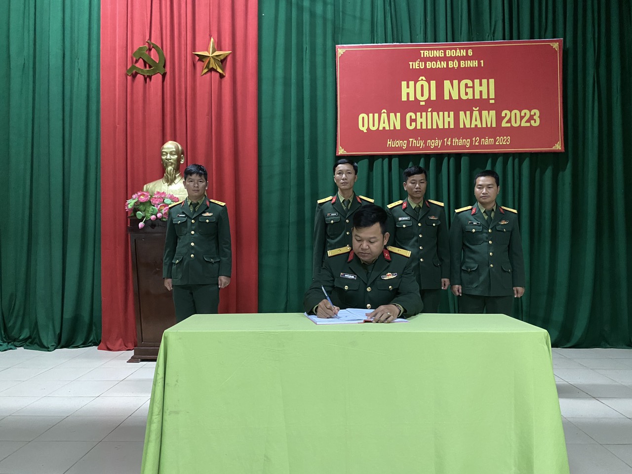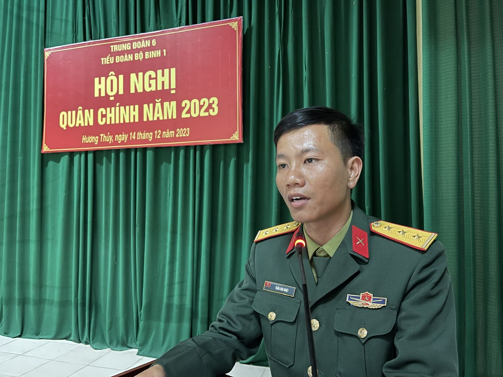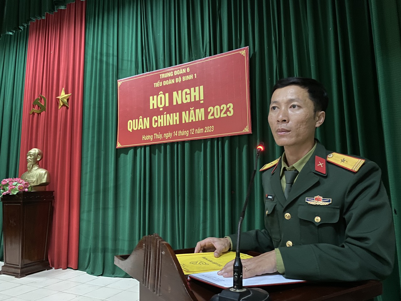 Phát biểu chỉ đạo tại Hội nghị, Thiếu tá Nguyễn Hải Nam – Phó Trung đoàn trưởng, Tham mưu trưởng Trung đoàn đã biểu dương những kết quả mà đơn vị đã đạt được trong năm 2023 đồng thời đề nghị trong thời gian tới Đảng uỷ, chỉ huy Tiểu đoàn tiếp tục triển khai thực hiện thắng lợi các nhiệm vụ được giao trong đó tập trung chú trọng duy trì nghiêm các chế độ trực sẵn sàng chiến đấu, xây dựng chính quy, quản lý tư tưởng kỷ luật, xây dựng ý chí cho 100% cán bộ, chiến sĩ luôn sẵn sàng nhận và hoàn thành xuất sắc mọi nhiệm vụ được giao. Thường xuyên luyện tập thuần thục các phương án sẵn sàng chiến đấu đồng thời sẵn sàng phương tiện, lực lượng để thực hiện những nhiệm vụ của Trung đoàn, nhiệm vụ đột xuất của Bộ CHQS tỉnh. Bên cạnh đó đồng chí Phó Trung đoàn trưởng, Tham mưu trưởng Trung đoàn cũng đề nghị Tiểu đoàn cần quan tâm, chăm lo đến đời sống của cán bộ, chiến sĩ trong toàn Tiểu đoàn.