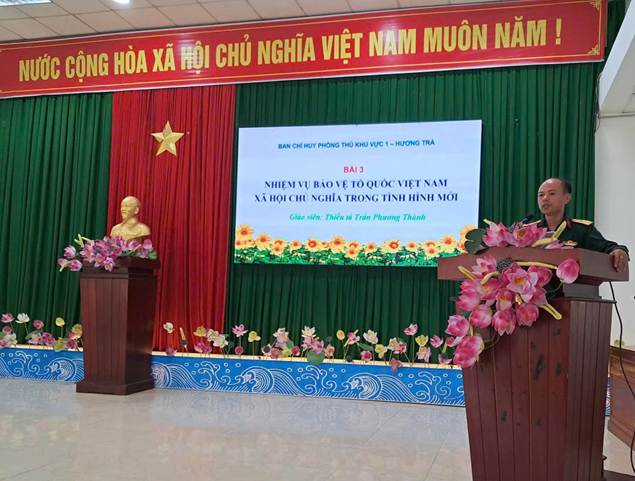 Để nâng cao nhận thức, trách nhiệm và trình độ kỹ, chiến thuật, khả năng làm chủ vũ khí trang bị cho đối tượng Dân quân năm thứ nhất, Đảng uỷ Ban Chỉ huy phòng thủ khu vực 1 - Hương Trà chú trọng huấn luyện toàn diện trên các nội dung như: nhận thức mới về nhiệm vụ bảo vệ Tổ quốc; chiến lược “Diễn biến hoà bình” của các thế lực thù địch; xây dựng và bảo vệ chủ quyền lãnh thổ, biên giới quốc gia; Dân quân tự vệ làm công tác vận động quần chúng; quan điểm, chính sách dân tộc, tôn giáo của Đảng và Nhà nước ta; đội ngũ từng người có súng và không có súng; kỹ thuật cấp cứu và vận chuyển người bị thương trong chiến đấu phòng thủ xã, phường; kỹ thuật sử dụng súng bộ binh, lưu đạn, thuốc nổ; các tư thế, động tác vận động cơ bản trong chiến đấu và cập nhật một số nội dung mới... Theo đó, chỉ đạo các cơ quan, đơn vị tổ chức huấn luyện chặt chẽ, nghiêm túc, đúng nội dung chương trình, thời gian, bảo đảm an toàn, đạt mục đích, yêu cầu đề ra.