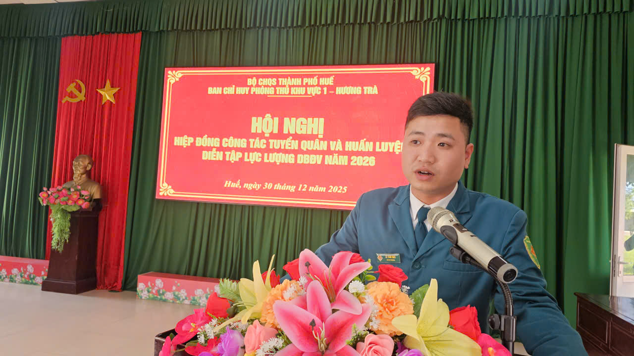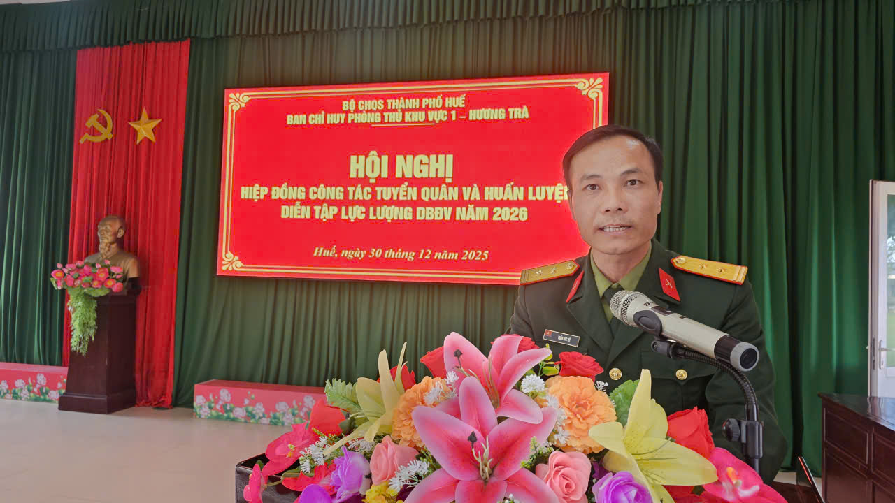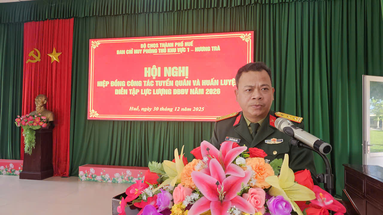 Chiều ngày 30/12, Ban Chỉ huy phòng thủ khu vực (PTKV) 1 – Hương Trà tổ chức hội nghị hiệp đồng công tác tuyển quân và huấn luyện, diễn tập lực lượng dự bị động viên năm 2026. Trung tá Trần Đức Vũ, Phó Chỉ huy trưởng Ban Chỉ huy PTKV 1 – Hương Trà chủ trì hội nghị. Thượng tá Nguyễn Ngọc Đức, Phó Tham mưu trưởng Bộ CHQS thành phố dự và chỉ đạo Hội nghị. Tham dự Hội nghị có đại diện các cơ quan của Bộ CHQS thành phố, đại biểu các đơn vị nhận quân và đơn vị nhận nguồn huấn luyện dự bị động viên (DBĐV)