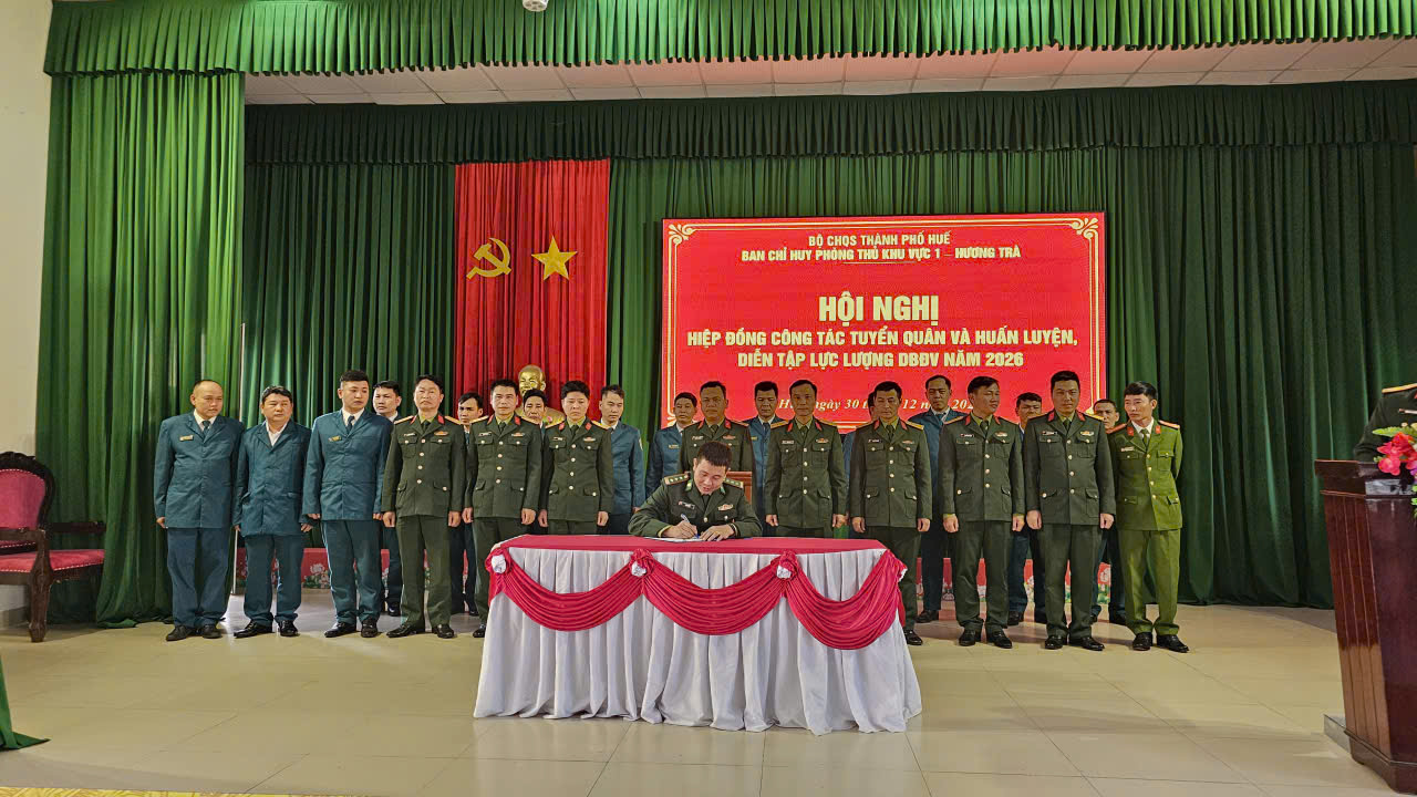 Tại Hội nghị, đại diện Ban Chỉ huy PTKV 1 – Hương Trà, hội đồng NVQS các xã phường và các đơn vị đã ký kết hiệp đồng giao nhận công dân nhập ngũ và huấn luyện, diễn tập DBĐV năm 2026.