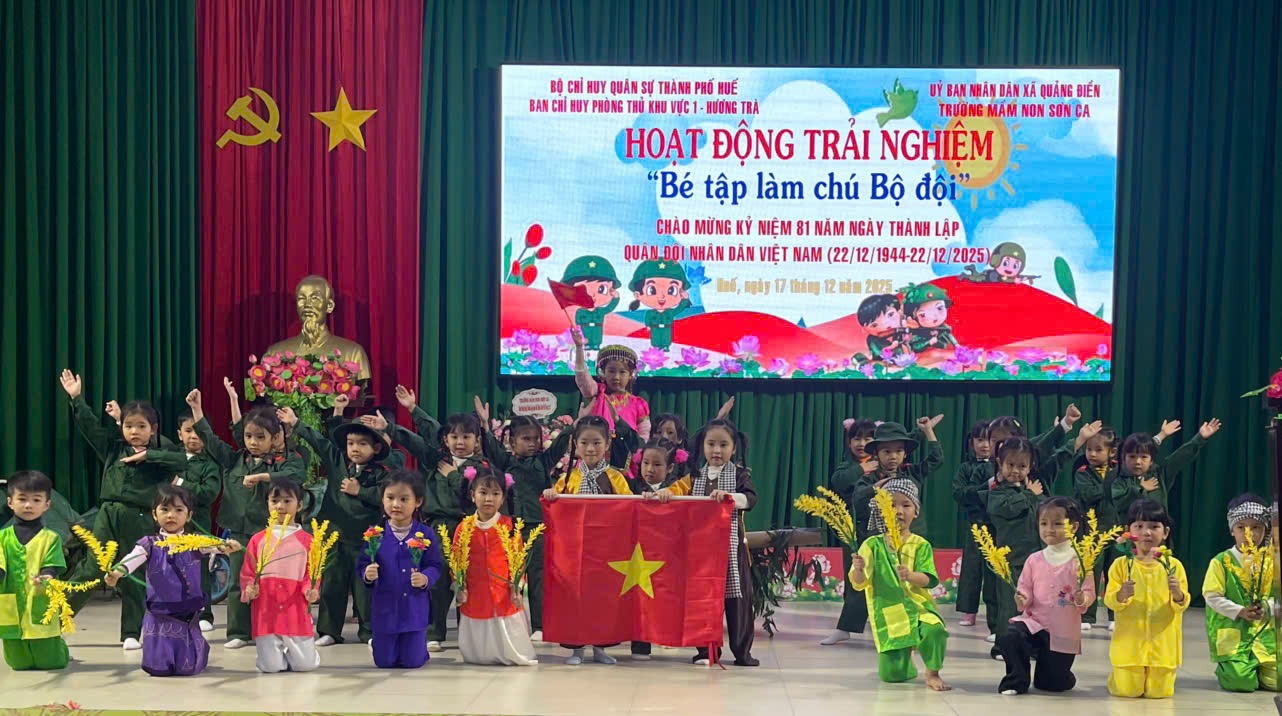 Trong hai ngày 17 và 18/12/2025, Ban Chỉ huy PTKV 1 – Hương Trà phối hợp với các trường: Trường mầm non Sơn Ca (xã Quảng Điền), Trường mầm non Phong An 2, Phong Hiền 1 (phường Phong Thái) tổ chức chương trình tham quan, trải nghiệm “Bé tập làm chú bộ đội” nhân kỷ niệm 81 năm ngày thành lập Quân đội nhân dân Việt Nam (22/12/1944 - 22/12/2025) và 36 năm Ngày hội Quốc phòng toàn dân (22/12/1989 - 22/12/2025)