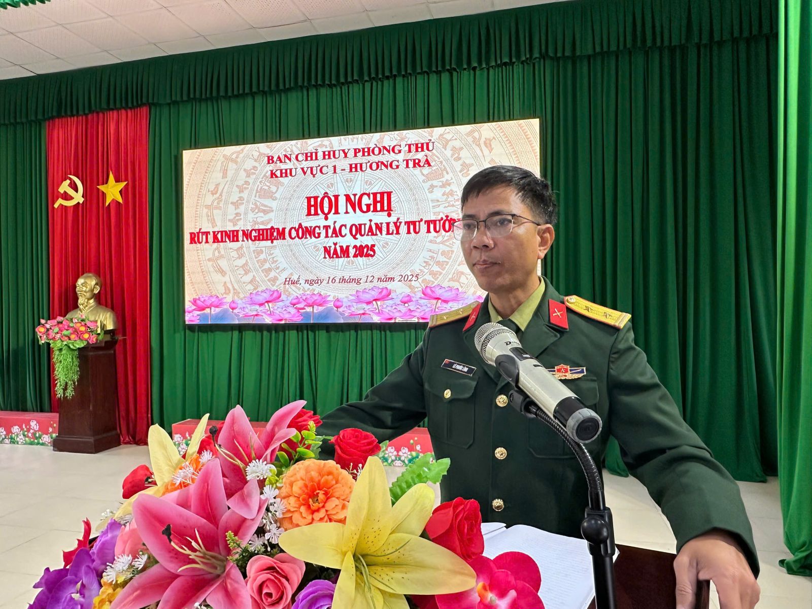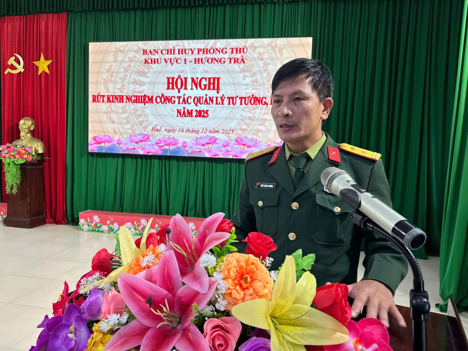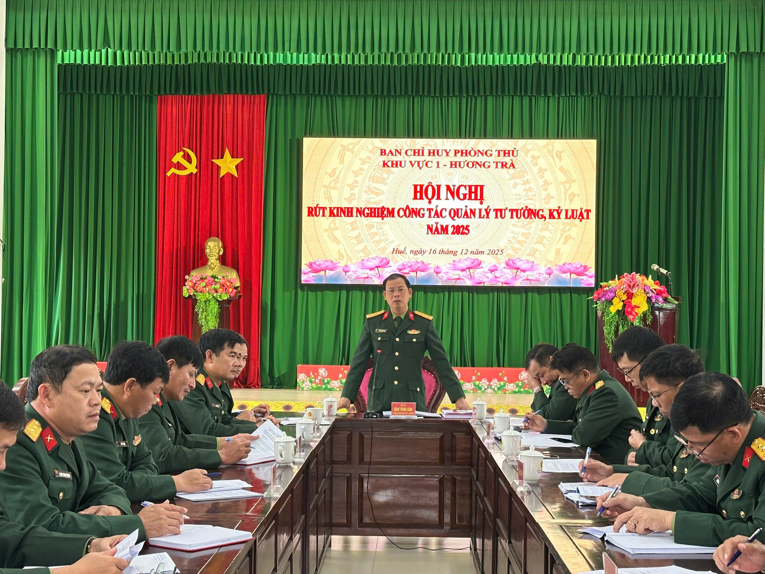 Sáng ngày 16/12/2025, Ban Chỉ huy PTKV 1 – Hương Trà tổ chức Hội nghị rút kinh nghiệm công tác quản lý tư tưởng, kỷ luật năm 2025 và học tập, quán triệt, triển khai thực hiện Nghị quyết Đại hội Đảng bộ Quân đội lần thứ XII, nhiệm kỳ 2025 - 2030. Thượng tá Trần Đình Quang – Phó Chủ nhiệm Chính trị Bộ Chỉ huy Quân sự thành phố dự và chỉ đạo hội nghị.