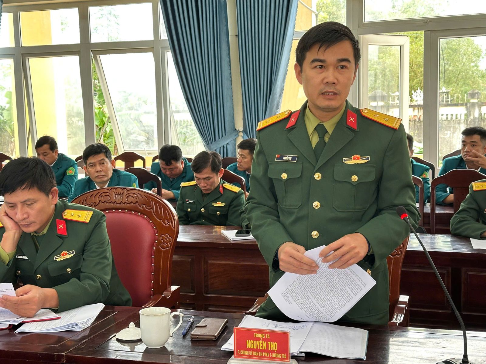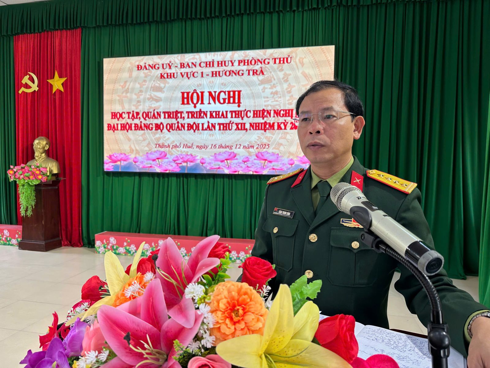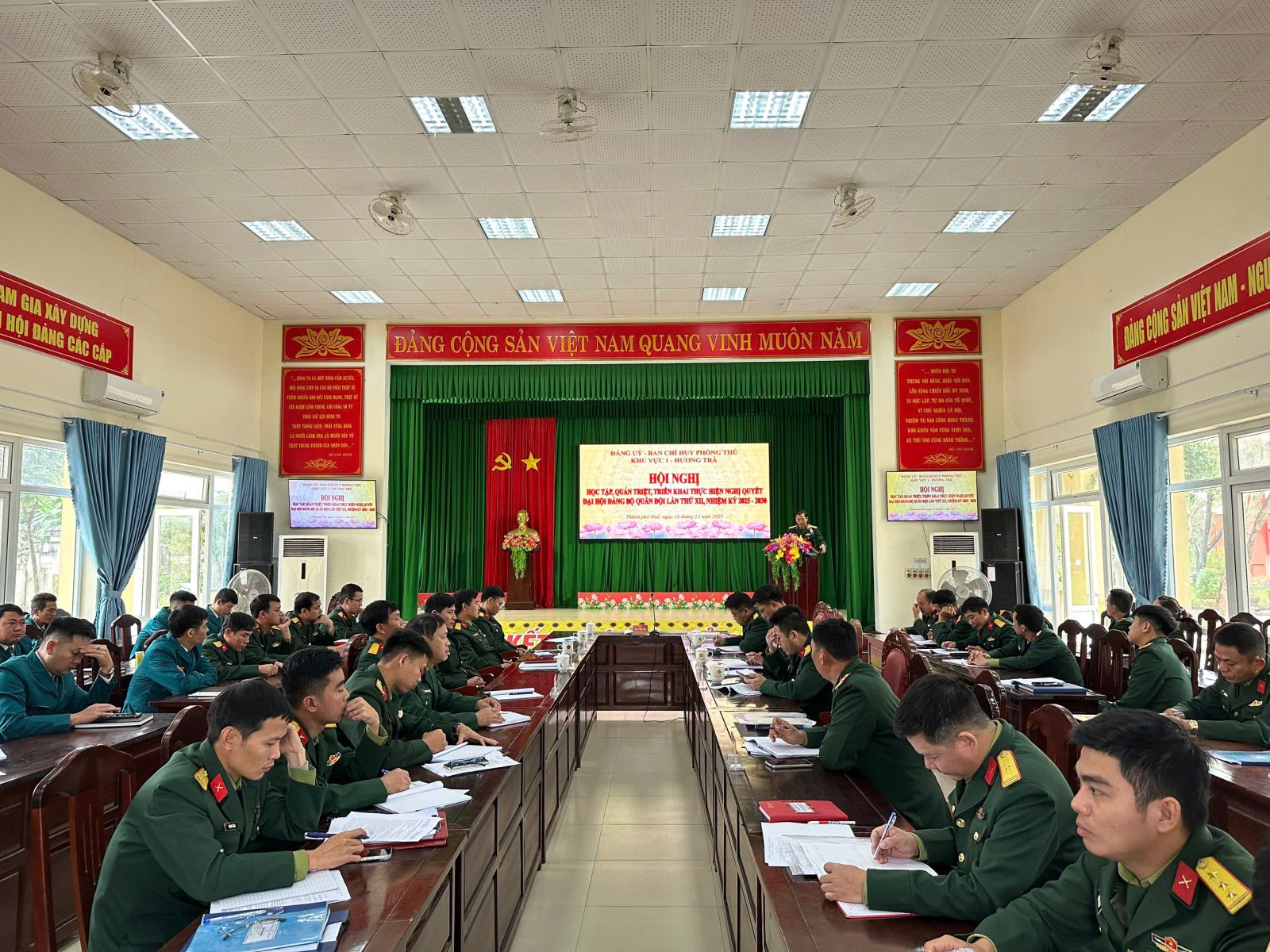 Tại hội nghị học tập, quán triệt, triển khai thực hiện nghị quyết Đại hội đại biểu Đảng bộ Quân đội lần thứ XII, nhiệm kỳ 2025-2030, cán bộ, đảng viên cơ quan và Ban CHQS các phường, xã đã được Đại tá Đặng Thanh Sáng - Bí thư Đảng uỷ, Chính ủy Ban Chỉ huy PTKV1 - Hương Trà truyền đạt các nội dung quan trọng. Theo đó, Đại hội đại biểu Đảng bộ Quân đội diễn ra từ ngày 29/9 đến này 02/10/2025 tại Thủ đô Hà Nội, Đại hội được tiến hành theo phương châm “Đoàn kết – Dân chủ - Kỷ cương – Kiên Định – Đột phá – Phát triển”; Nghị quyết được thông qua tại Đại hội đã xác định rõ phương hướng, mục tiêu, nhiệm vụ và các giải pháp, tạo tiền đề vững chắc để Quân đội hoàn thành xuất sắc mọi nhiệm vụ mà Đảng, Nhà nước và Nhân dân giao phó...