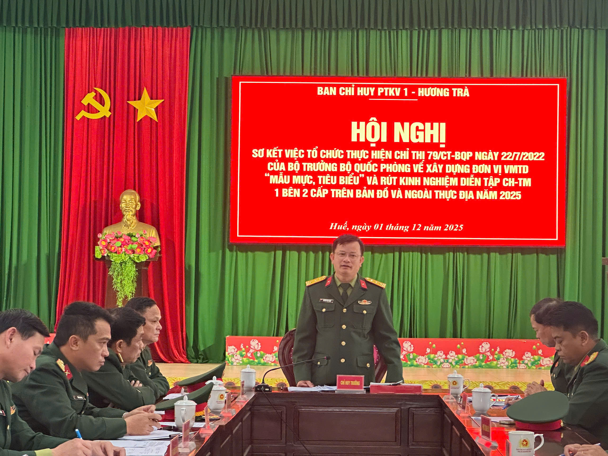 Sáng ngày 01/12, Ban Chỉ huy PTKV1 – Hương Trà đã tổ chức Hội nghị sơ kết thực hiện Chỉ thị 79/CT-BQP ngày 22/7/2022 của Bộ Quốc phòng về xây dựng đơn vị vững mạnh toàn diện “Mẫu mực, tiêu biểu” và rút kinh nghiệm Diễn tập CH-TM 1 bên 2 cấp trên bản đồ và ngoài thực địa năm 2025. Thượng tá Nguyễn Văn Thạnh – Phó Bí thư Đảng uỷ, Chỉ huy trưởng Ban Chỉ huy PTKV1 – Hương Trà chủ trì hội nghị. Tham dự hội nghị có các đồng chí trong Đảng uỷ, Chỉ huy và toàn thể sĩ quan, quân nhân chuyên nghiệp Ban Chỉ huy PTKV1 – Hương Trà.
