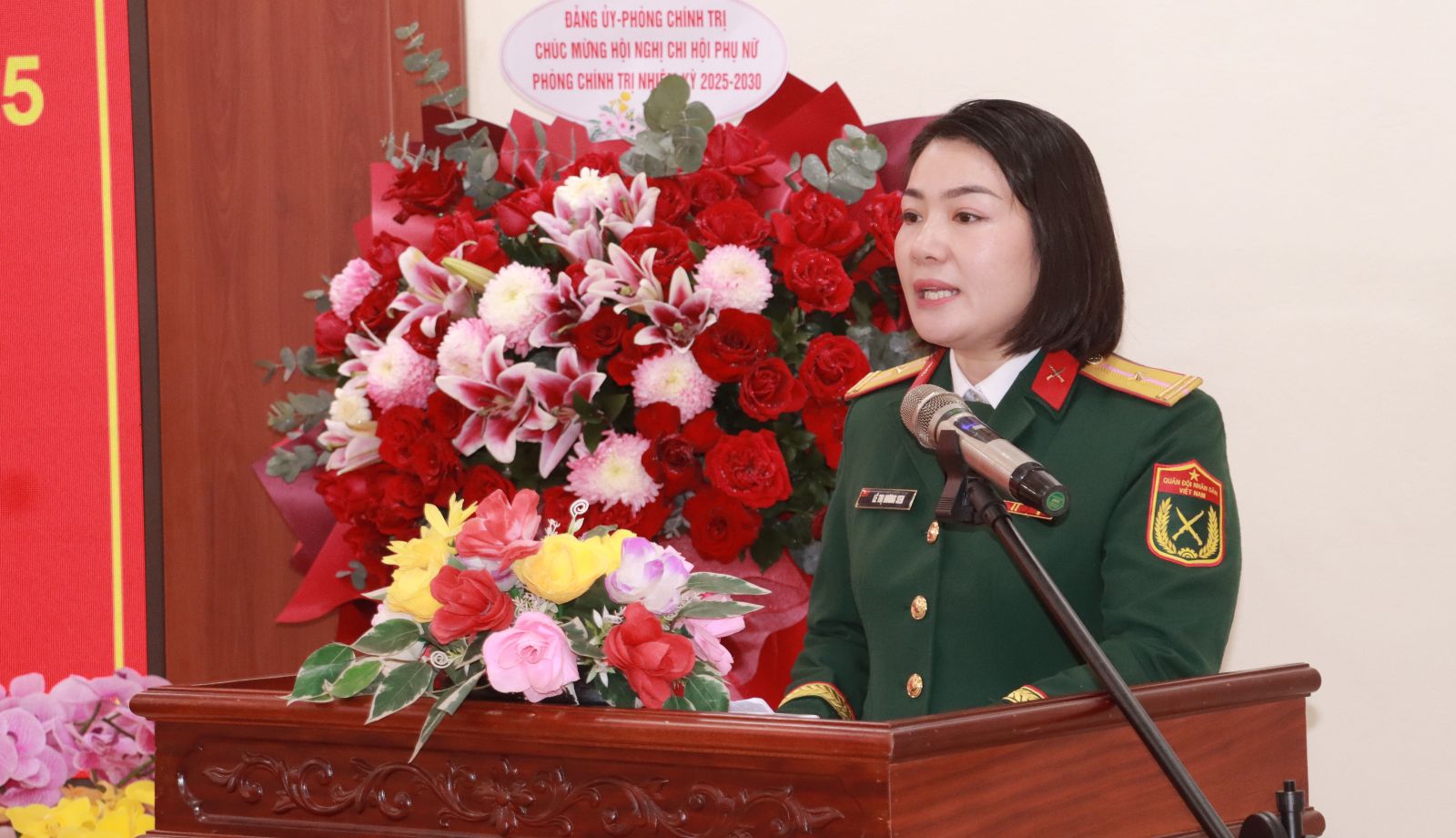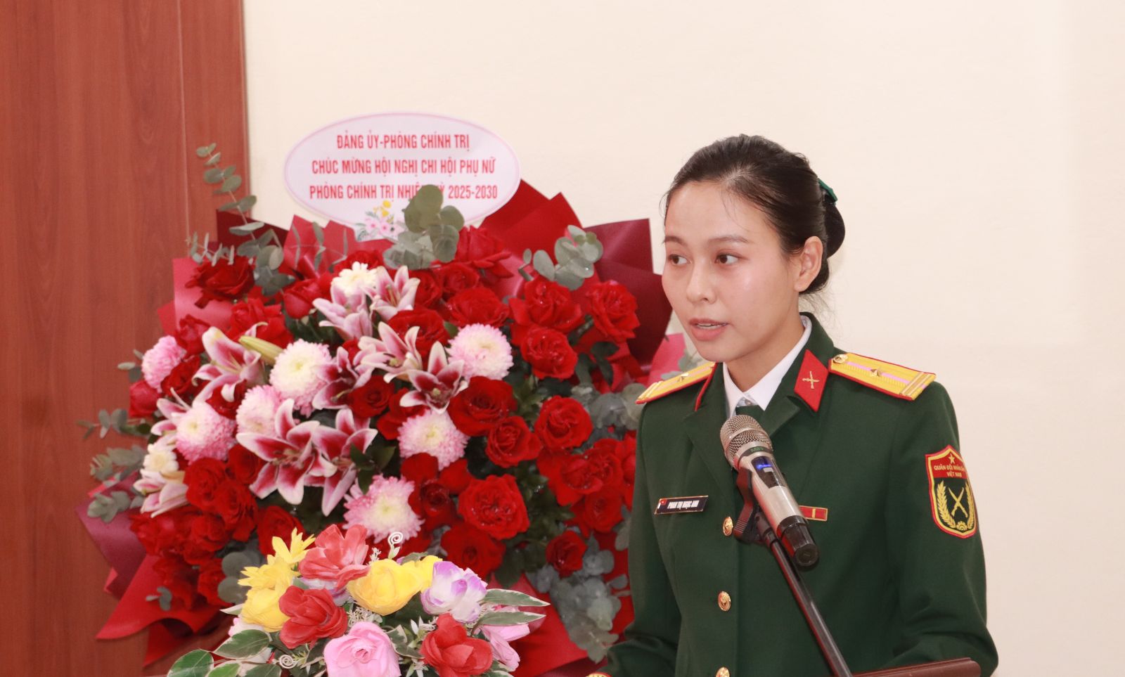 Nhiệm kỳ 2025-2030, Chi hội Phụ nữ Phòng Chính trị phấn đấu thực hiện thắng lợi một số chỉ tiêu: 100% cán bô, hội viên đăng ký và thực hiện phong trào thi đua Phụ nữ quân đội Đoàn kết - Sáng tạo, hoàn thành tốt nhiệm vụ, xây dựng gia đình hạnh phúc”, hàng năm phấn đấu có 98% trở lên hội viên đạt tiêu chuẩn của phong trào và danh hiệu hội viên tiên tiến; 20 -25% hội viên phụ nữ xuất sắc. Phấn đấu hàng năm có 100% cán bộ, hội viên tham gia học tập, huấn luyện theo đúng nội dung, chương trình quy định. Kết quả kiểm tra 100% đạt yêu cầu, có trên 80% khá, giỏi, chấp hành nghiêm chủ trương, chính sách của Đảng, pháp luật Nhà nước, kỷ luật Quân đội, chế độ nền nếp của đơn vị; không có hội viên vi phạm kỷ luật phải xử lý. Phấn đấu đạt tiêu chí: Bốn tốt”, có bản lĩnh chính trị, lập trường tư tưởng vững vàng, sẵn sàng nhận và hoàn thành tốt và thành xuất sắc nhiệm vụ được giao, xây dựng gia đình “No nấm, tiến bộ, hạnh phúc, văn minh”, phấn đấu 98% trở lên gia đình hội viên đạt tiêu chí “5 không, 3 sạch” và đạt danh hiệu “Gia đình văn hóa”./.