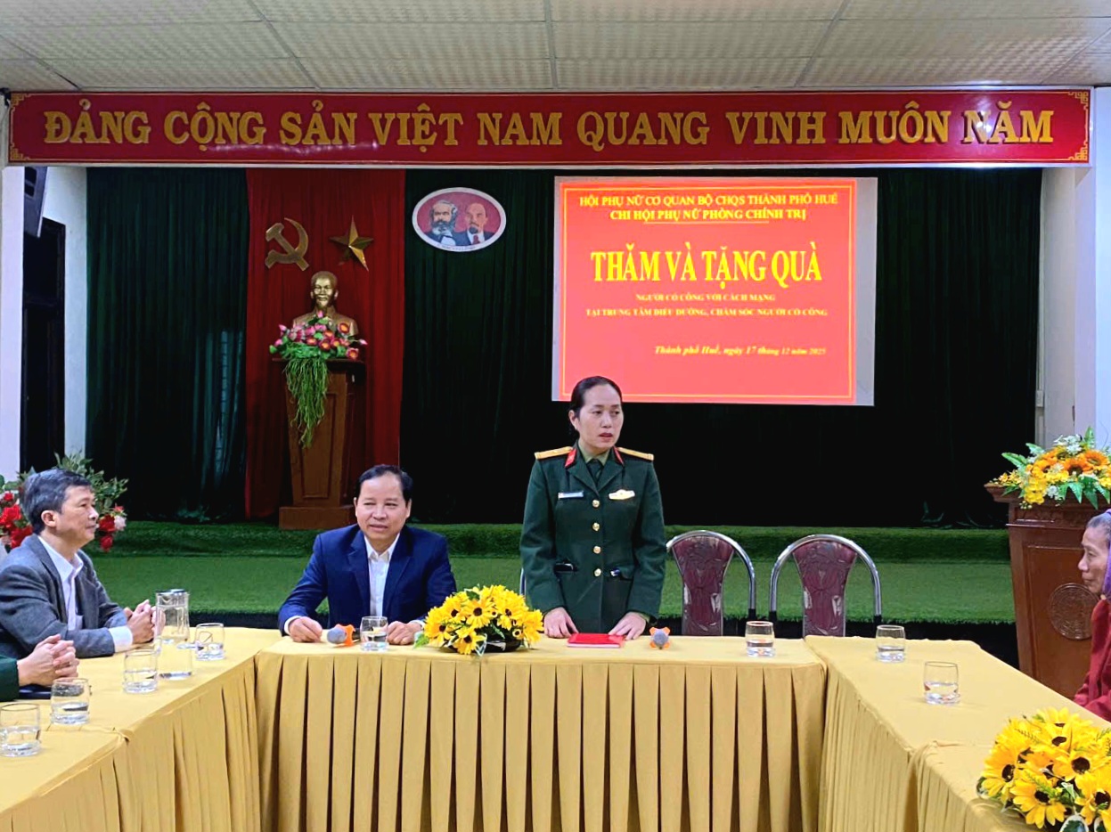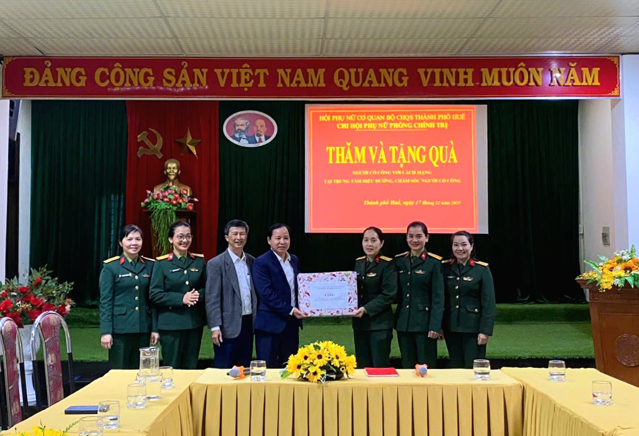 Nhân dịp kỷ niệm 81 năm Ngày thành lập Quân đội Nhân dân Việt Nam (22/12/1944 - 22/12/2025) và 36 năm Ngày hội Quốc phòng toàn dân (22/12/1989 - 22/12/2025), chiều ngày 17/12, Chi hội Phụ nữ Phòng Chính trị đã đến thăm và tặng quà tại Trung tâm điều dưỡng, chăm sóc người có công Huế.