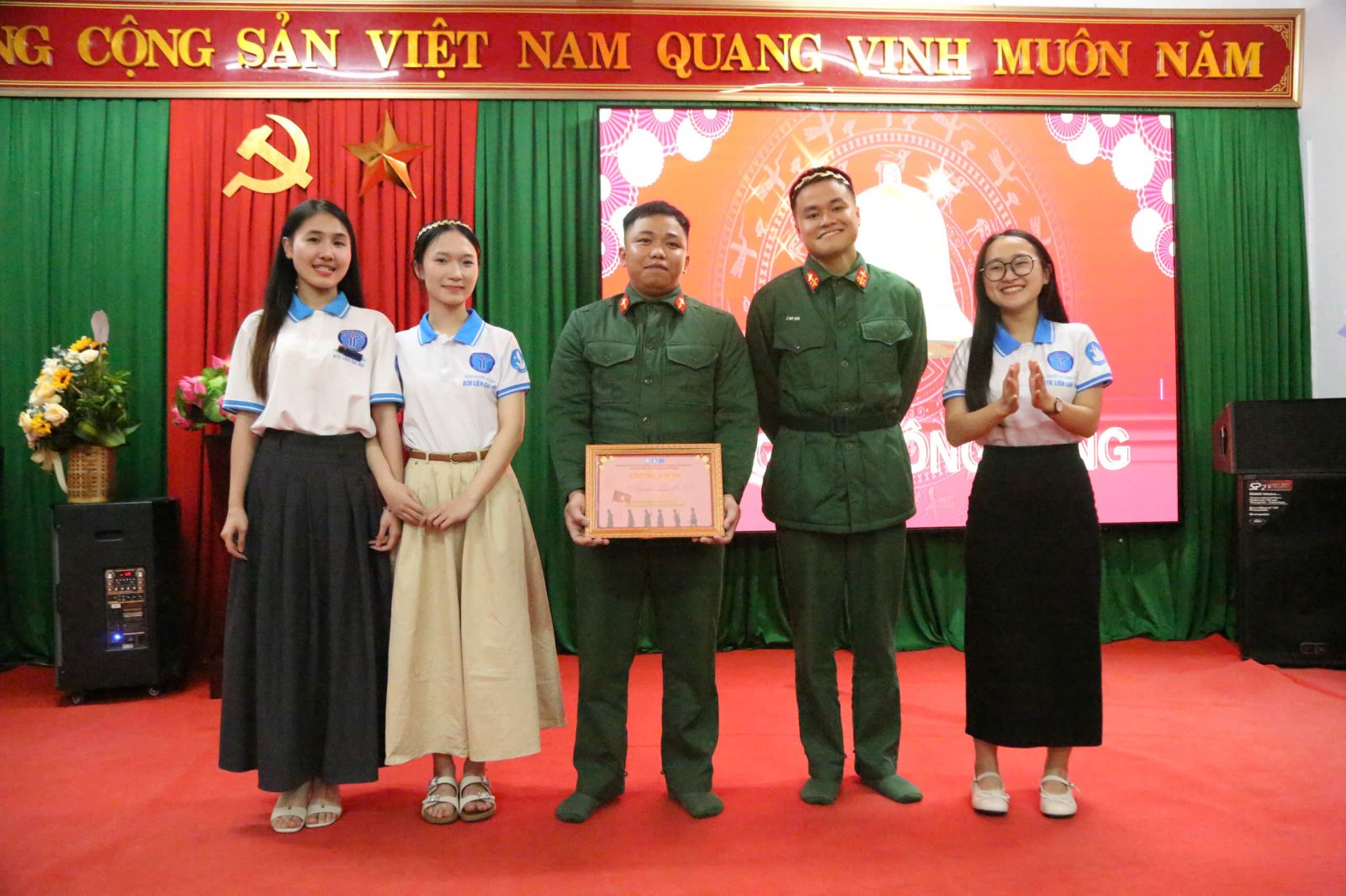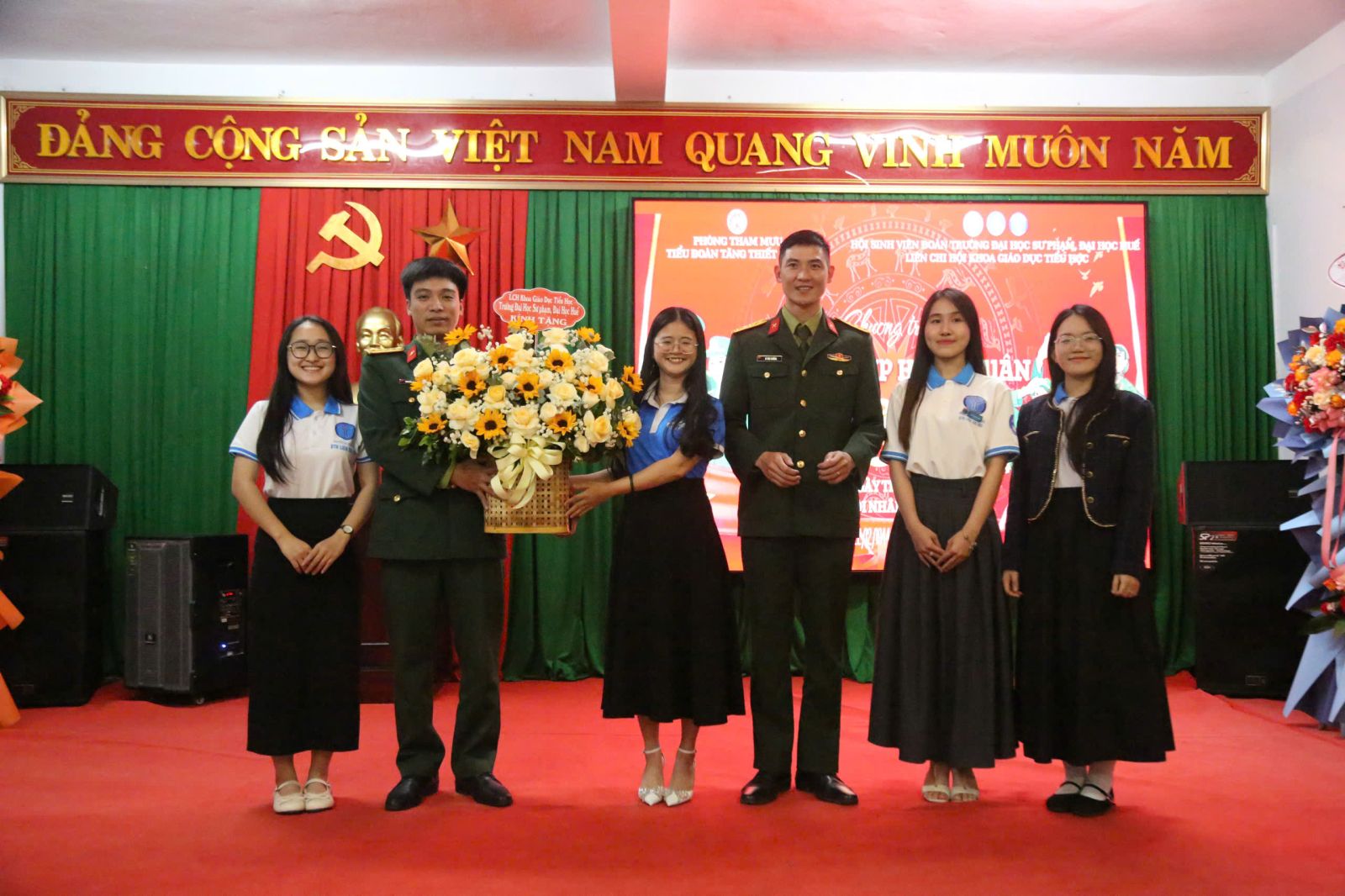 Cán bộ, Chiến sĩ Tiểu đoàn Tăng Thiết giáp 3 và các bạn sinh viên Liên Chi hội Khoa giáo dục Tiểu học Trường ĐHSP Huê chụp ảnh lưu niệm