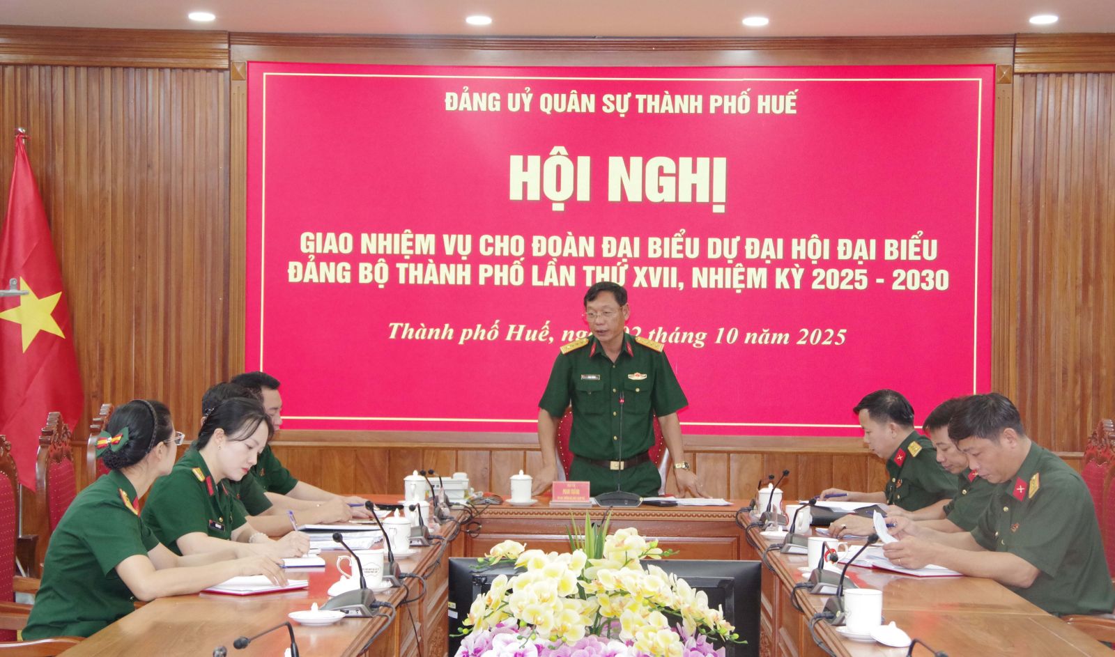 Sáng ngày 02/10, Đảng uỷ quân sự Thành phố Huế giao nhiệm vụ cho Đoàn Đại biểu đi dự Đại hội Đại biểu Đảng bộ thành phố Huế lần thứ XVII, nhiệm kỳ 2025 – 2030. Đại tá Phan Thắng – UVTV thành uỷ, Chỉ huy trưởng Bộ CHQS thành phố chủ trì hội nghị