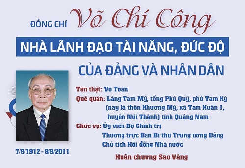 Gần 80 năm hoạt động cách mạng, cuộc đời của đồng chí Võ Chí Công gắn liền với quá trình cách mạng, với những sự kiện lịch sử oanh liệt của Đảng và Nhân dân ta trong suốt thế kỷ XX. Đồng chí là tấm gương cao đẹp của một người cộng sản kiên cường, mẫu mực, là một trong những người học trò xuất sắc của Chủ tịch Hồ Chí Minh, suốt đời tận trung với nước, tận hiếu với dân.
