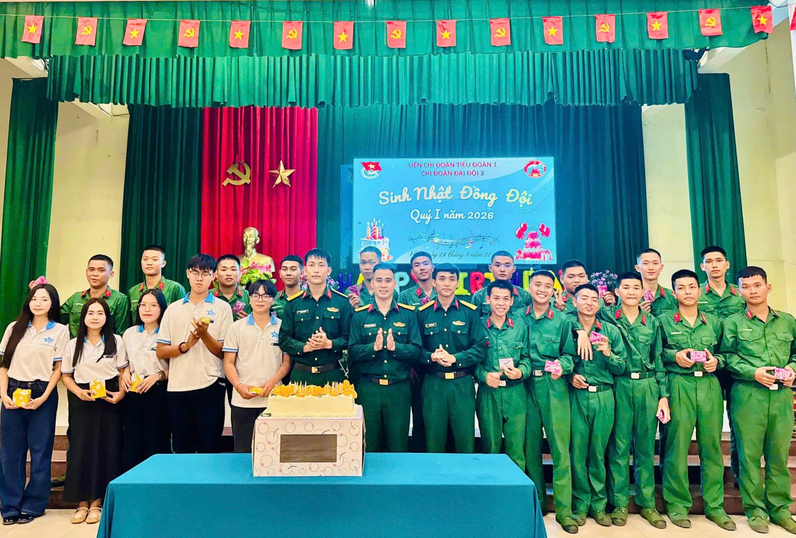 Nằm trong chuỗi các hoạt động Tháng Thanh niên năm 2026, nhằm tạo không khí vui tươi, gắn kết tình đồng chí, đồng đội, bảo đảm tốt đời sống tinh thần cho cán bộ, chiến sĩ, đặc biệt là Chiến sĩ mới nhập ngũ. Từ ngày 28 đến ngày 29/3, Liên Chi đoàn, các Chi đoàn trực thuộc Đoàn cơ sơ Trung đoàn 6 đồng loạt tổ chức chương trình “Sinh nhật đồng đội - Kết nối yêu thương” cho cán bộ, chiến sĩ có ngày sinh trong Quý I năm 2026. Tham dự chương trình có đồng đủ cán bộ, đoàn viên thanh niên trong toàn Đoàn cơ sở, các đơn vị kết nghĩa và người thân gia đình chiến sĩ.