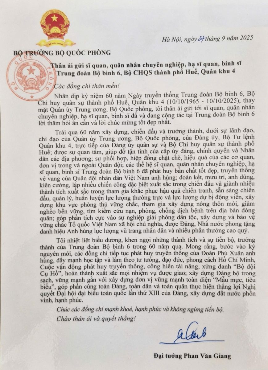Nhân dịp kỷ niệm 60, năm ngày truyền thống Trung đoàn Bộ binh 6, Bộ Chỉ huy quân sự thành phố Huế, Quân khu 4 (10/10/1965 - 10/10/2025), thay mặt Quân ủy Trung ương, Bộ Quốc phòng, tôi thân ái gửi tới sĩ quan, quân nhân chuyên nghiệp, hạ sĩ quan, binh sĩ đã và đang công tác tại Trung đoàn Bộ binh 6 lời thăm hỏi ân cần và lời chúc tốt đẹp nhất.
