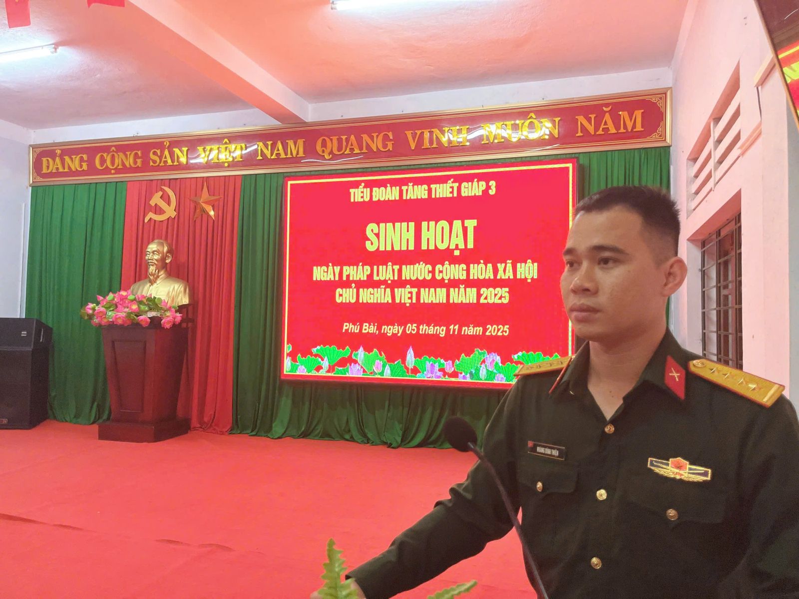 Ngày 05/11, nhằm hưởng ứng Ngày Pháp luật Việt Nam (09/11) năm 2025, Tiểu đoàn Tăng Thiết giáp 3 tổ chức sinh hoạt Ngày Pháp luật với chủ đề: Nâng cao ý thức thượng tôn Pháp luật, xây dựng đơn vị vững mạnh toàn diện “mẫu mực, tiêu biểu”, hoàn thành xuất sắc mọi nhiệm vụ được giao.