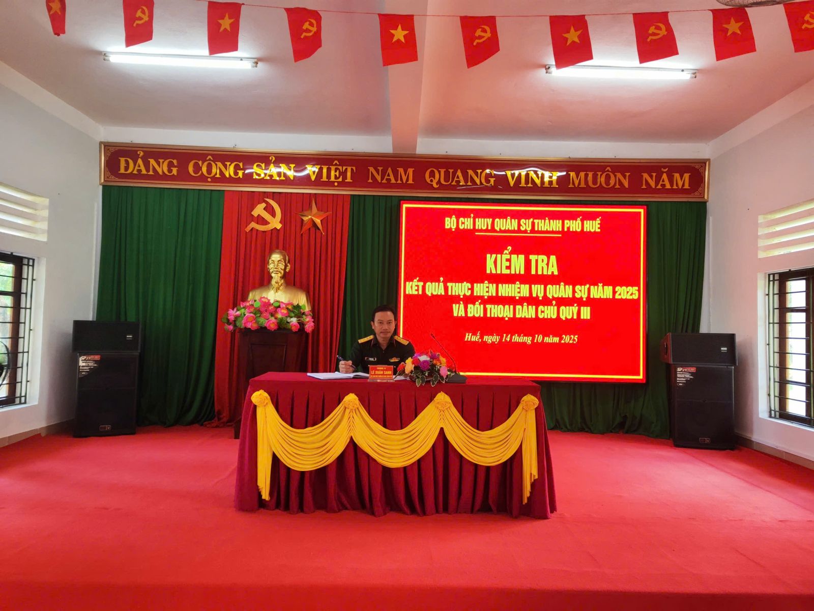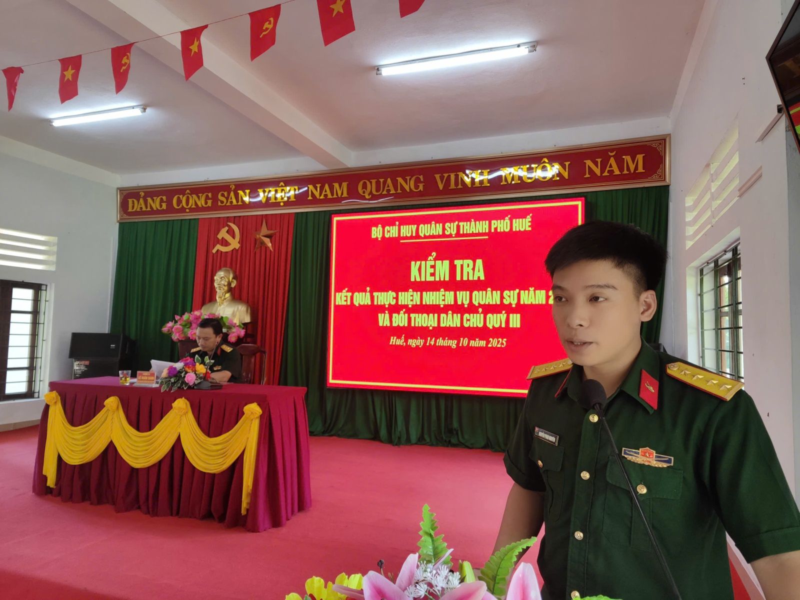 Sáng ngày 14/10, Đoàn kiểm tra Bộ Chỉ huy Quân sự (CHQS) thành phố Huế do Thượng tá Lê Xuân Sanh, Phó Tham mưu trưởng Bộ CHQS thành phố làm Trưởng đoàn đã tiến hành kiểm tra kết quả thực hiện nhiệm vụ quân sự năm 2025 và đối thoại dân chủ quý III tại Tiểu đoàn Tăng Thiết giáp 3.