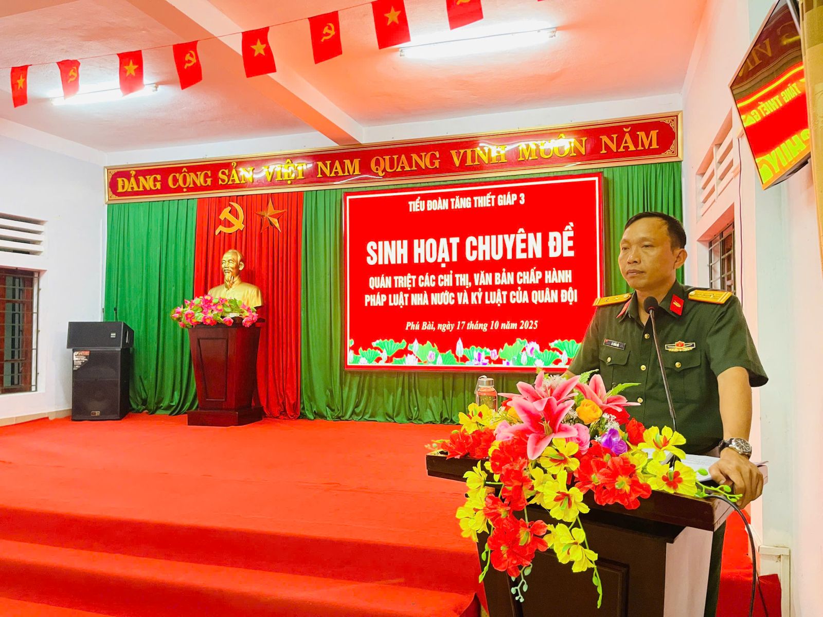 Ngày 17/10, Tiểu đoàn Tăng Thiết giáp 3 tổ chức sinh hoạt chuyên đề về quán triệt các chỉ thị, văn bản chấp hành pháp luật Nhà nước và kỷ luật quân đội cho cán bộ, quân nhân chuyên nghiệp (QNCN), hạ sĩ quan - chiến sĩ (HSQ-CS) trong toàn Tiểu đoàn. Trung tá Lê Đình Hải, Tiểu đoàn trưởng chủ trì buổi sinh hoạt, cùng dự có đồng chí Đại úy Nguyễn Phan Nguyên, Chính trị viên Tiểu đoàn.