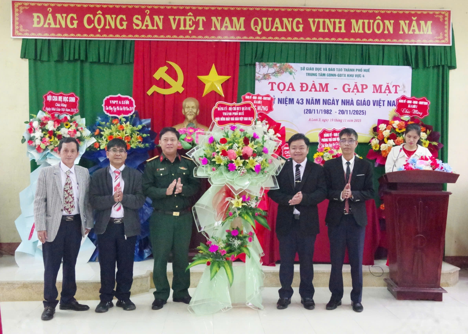 Nhân kỷ niệm 43 năm Ngày Nhà giáo Việt Nam 20/11(20/11/1982-20/11/2024), đoàn công tác Ban Chỉ huy Phòng thủ Khu vực 2 - A Lưới do đồng chí Thượng tá Hồ Minh Hương - Phó Chính ủy làm trưởng đoàn đã đến thăm, tặng hoa chúc mừng Trung tâm Giáo dục nghề nghiệp - Giáo dục thường xuyên Khu vực 4.