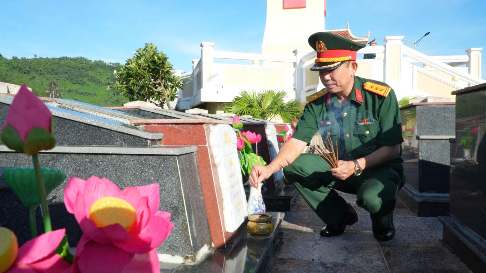 Thượng tá Lê Đức - Chỉ huy trưởng Ban Chỉ huy PTKV dâng hương tại phần mộ các anh hùng liệt sĩ