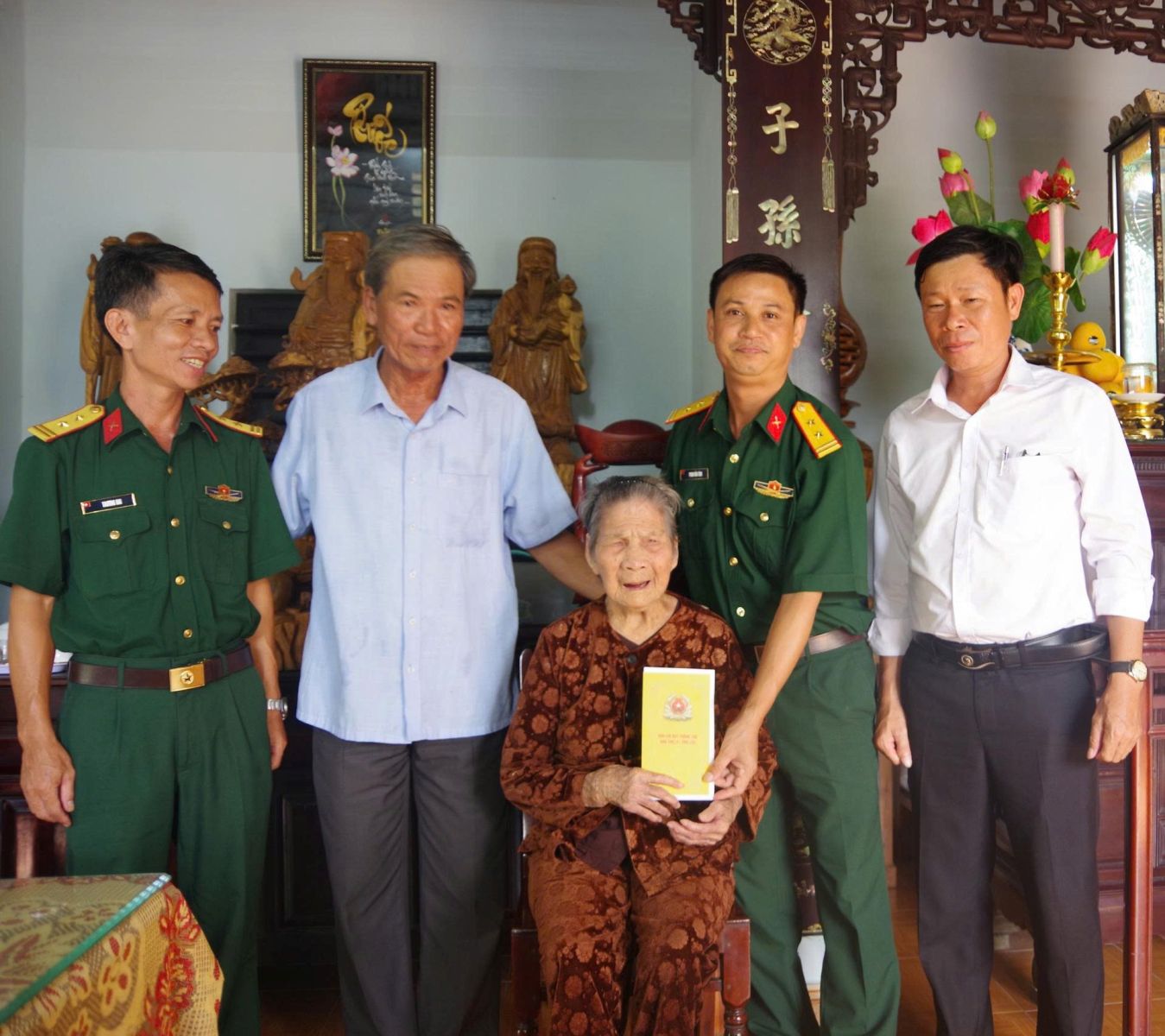 Trung tá Phan Văn Tình - Phó Chính uỷ Ban Chỉ huy PTKV tặng quà cho Mẹ Việt Nam anh hùng Bạch Thị Xữ