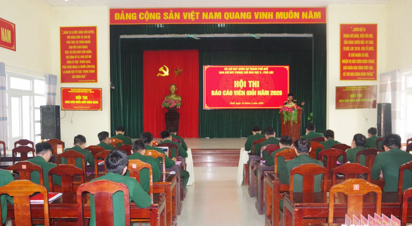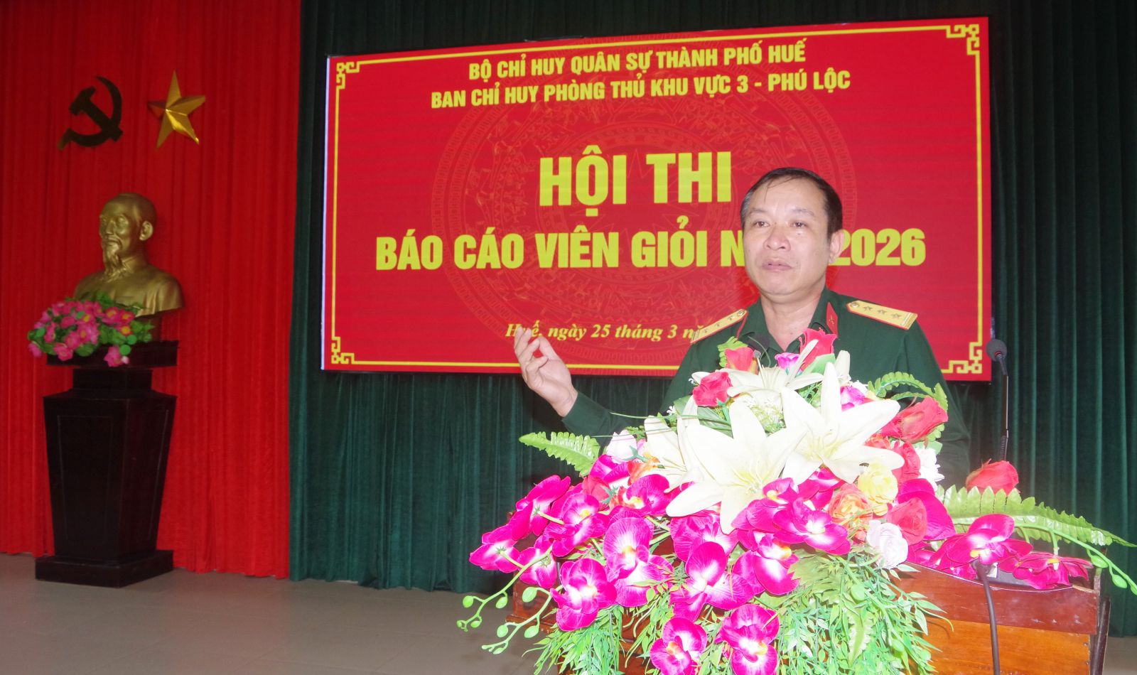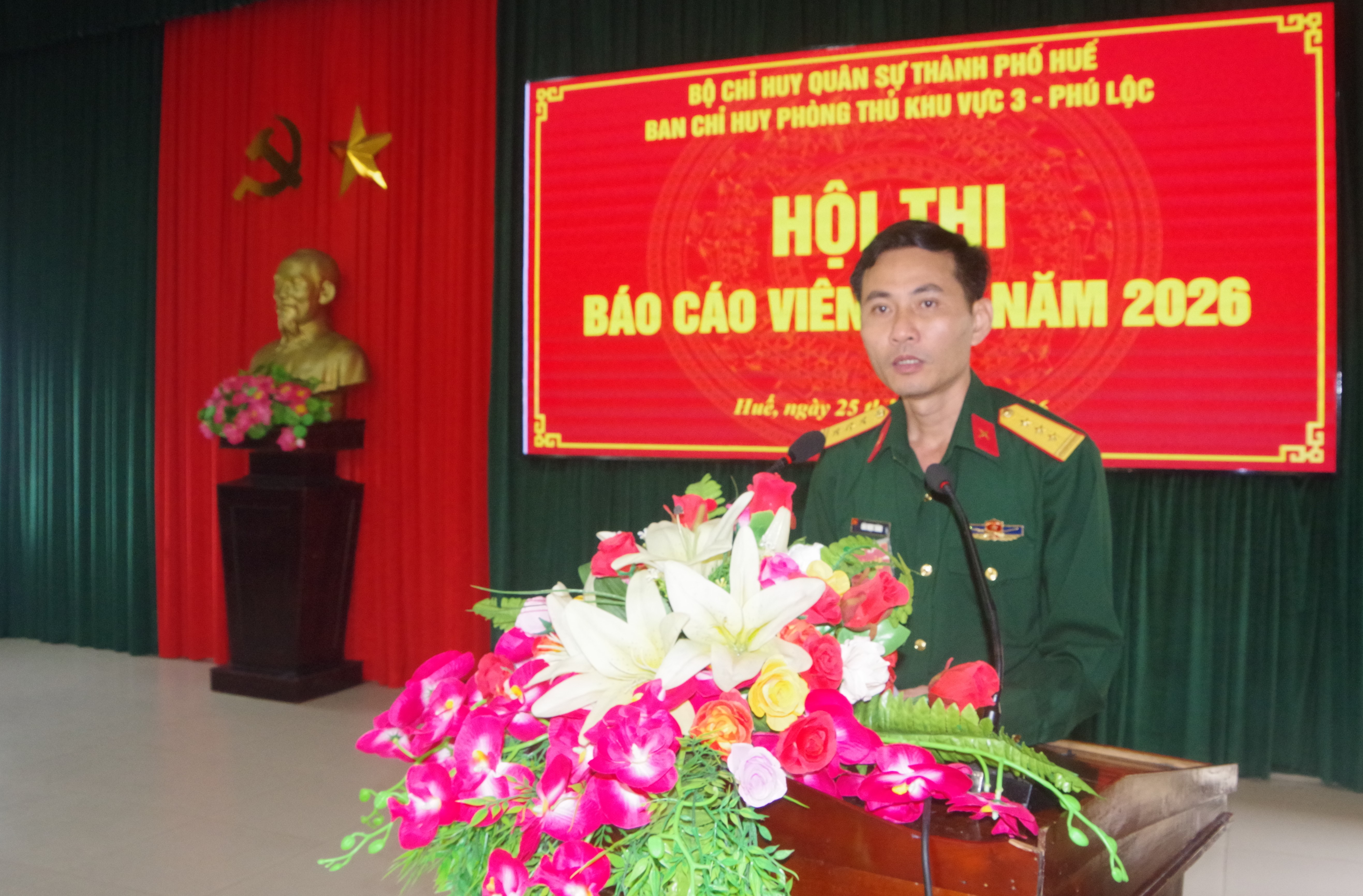 Sáng ngày 25/3, Ban chỉ huy Phòng thủ khu vực 3 - Phú Lộc tổ chức khai mạc Hội thi Báo cáo viên giỏi năm 2026. Thượng tá Đào Ngọc Thành, ĐUV ĐUQS thành phố, Bí thư Đảng uỷ, Chính uỷ Ban CH PTKV chủ trì khai mạc hội thi. Tham dự và chỉ đạo Hội thi có Thượng tá Trần Đình Quang, Phó Chủ nhiệm Chính trị, Bộ CHQS thành phố.