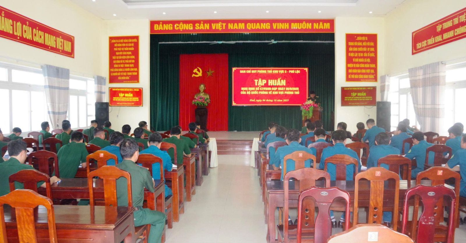 Chiều ngày 06/10, Ban chỉ huy Phòng thủ khu vực (PTKV) 3 - Phú Lộc Bộ CHQS TP Huế tổ chức tập huấn Nghị định 47 và Thông tư 84 của Bộ Quốc phòng cho 87 đồng chí là cán bộ Sĩ quan, QNCN Cơ quan và Chỉ huy trưởng, Phó chỉ huy trưởng Ban Chỉ huy quân sự 13 xã, phường trên địa bàn. Thượng tá Trần Chí Thanh - Phó Chỉ huy trưởng, Tham mưu trưởng Ban Chỉ huy PTKV Dự và chỉ đạo lớp tập huấn.