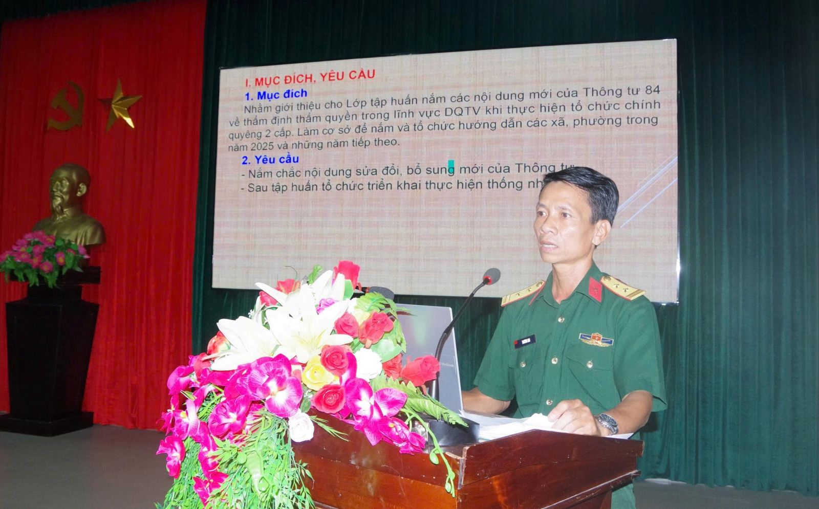 Trong thời gian 1/2 ngày lớp tập huấn được nghiên cứu các nội dung: Nghị định 47/VBHN-BQP ngày 06/9/2025 của Bộ Quốc phòng về khu vực phòng thủ; Thông tư số 84/2025/TT-BQP ngày 07/8/2025 của Bộ Quốc phòng về sửa đổi bổ sung một số điều các Thông tư của Bộ trưởng Bộ Quốc phòng về phân định thẩm quyền trong lĩnh vực Dân quân tự vệ khi tổ chức chính quyền địa phương 02 cấp; Phương pháp soạn thảo văn kiện tác chiến, Quyết tâm tác chiến phòng thủ của chỉ huy trưởng, kế hoạch tác chiến, kế hoạch hiệp đồng tác chiến của Ban CHQS xã, phường; phương pháp đồng chí Chỉ huy trưởng Ban CHQS xã, phường báo cáo quyết tâm tác chiến phòng thủ với cấp trên, với Đảng ủy xã, phường; phương pháp hiệp đồng tác chiến…