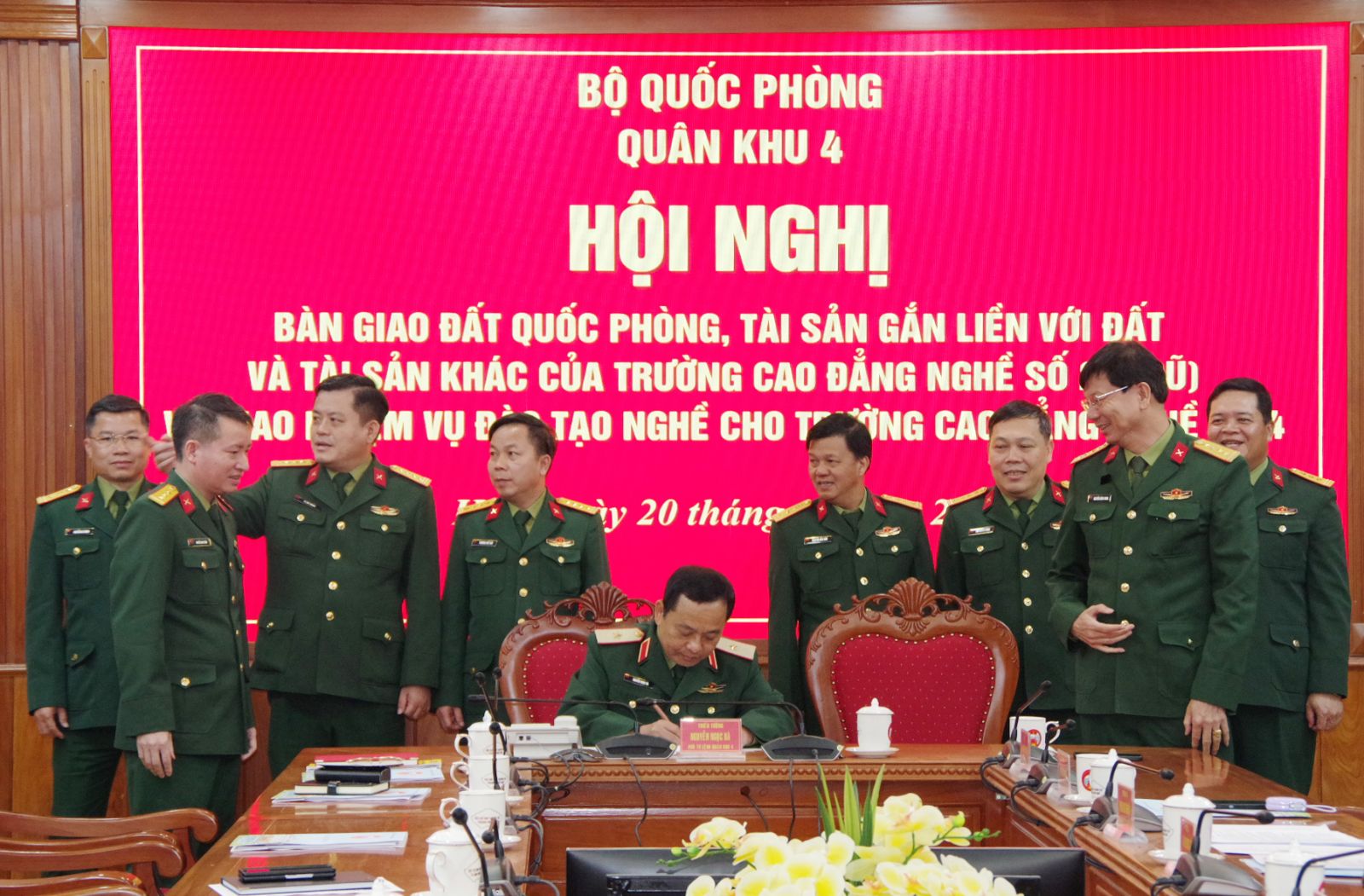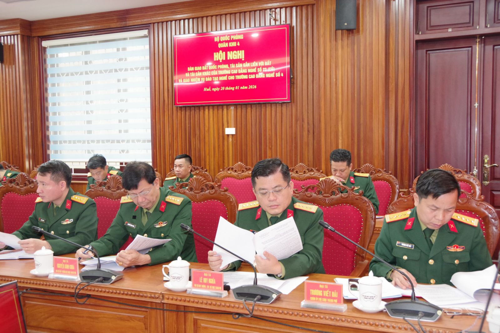 Chiều 20/1 tại thành phố Huế, Quân khu 4 tổ chức hội nghị bàn giao đất quốc phòng, tài sản gắn liền với đất và các tài sản khác của Trường Cao đẳng nghề số 23 (cũ) cho Trường Cao đẳng nghề số 4 thuộc Quân khu 4. Thiếu tướng Nguyễn Ngọc Hà, Phó Tư lệnh Quân khu 4 dự và chủ trì hội nghị. Tham dự Hội nghị có Đại tá Nguyễn Hữu Đàn - Phó Tham mưu trưởng Quân khu; Đại tá Nguyễn Kỳ Hồng - Phó Chủ nhiệm Chính trị Quân khu; Đại tá Phan Duy Thuận, Phó Chủ nhiệm Hậu cần - Kỹ thuật Quân khu; đại biểu các cơ quan chức năng Quân khu 4; lãnh đạo Bộ Chỉ huy Quân sự (CHQS) thành phố Huế có Đại tá Trương Viết Hải - TUV, Chính uỷ, Đại tá Lê Huy Nghĩa - Phó Chỉ huy trưởng, Tham mưu trưởng, Đại tá Nguyễn Đình Khoa - Phó Chỉ huy trưởng Bộ CHQS thành phố cùng lãnh đạo Trường Cao đẳng nghề số 4.