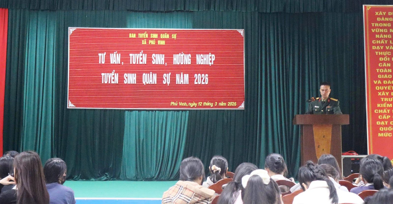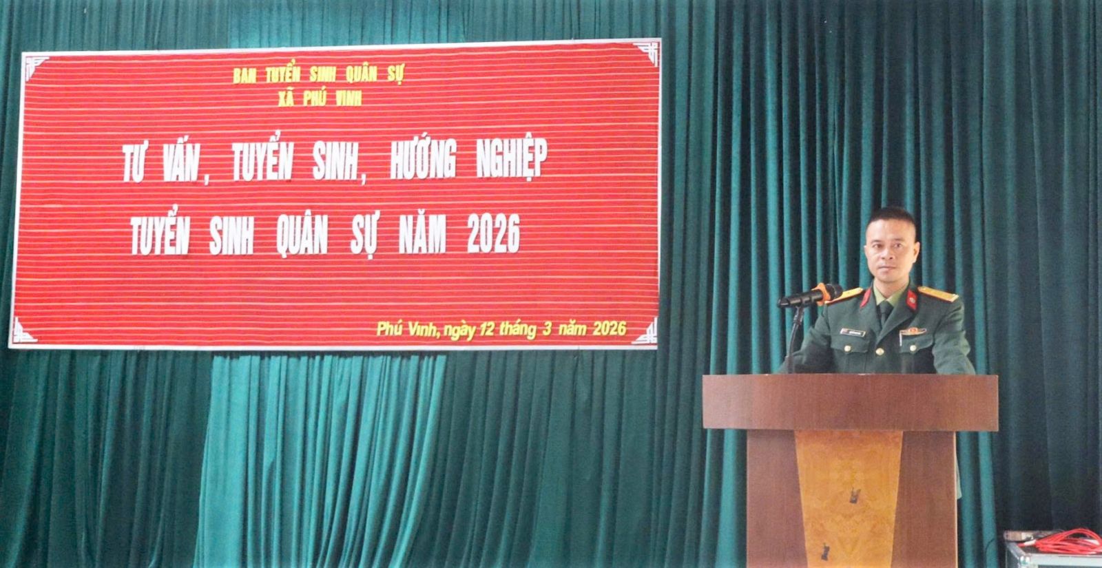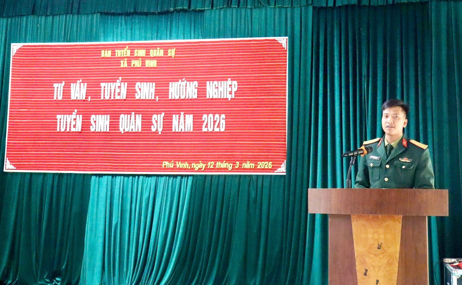 Sáng ngày 12/3, Ban Tuyển sinh quân sự xã Phú Vinh tổ chức tuyên truyền, tư vấn, hướng nghiệp tuyển sinh quân sự năm 2026 cho hơn 300 em học sinh khối 12, Trường Trung học phổ thông (THPT) Vinh Xuân, xã Phú Vinh.