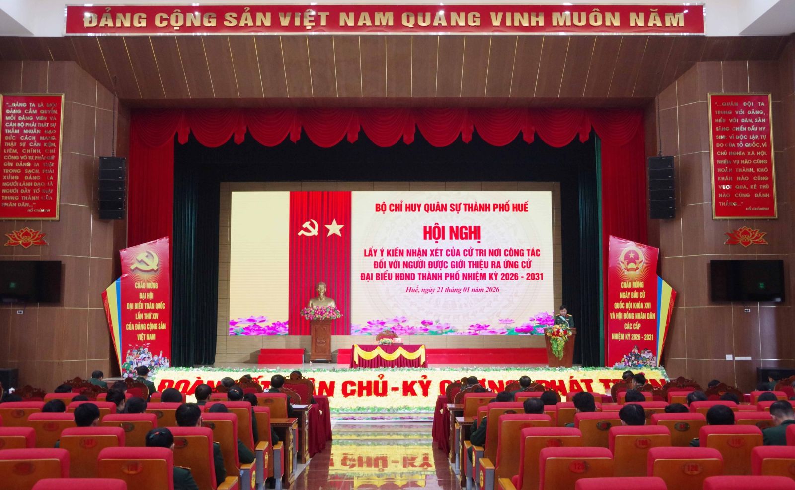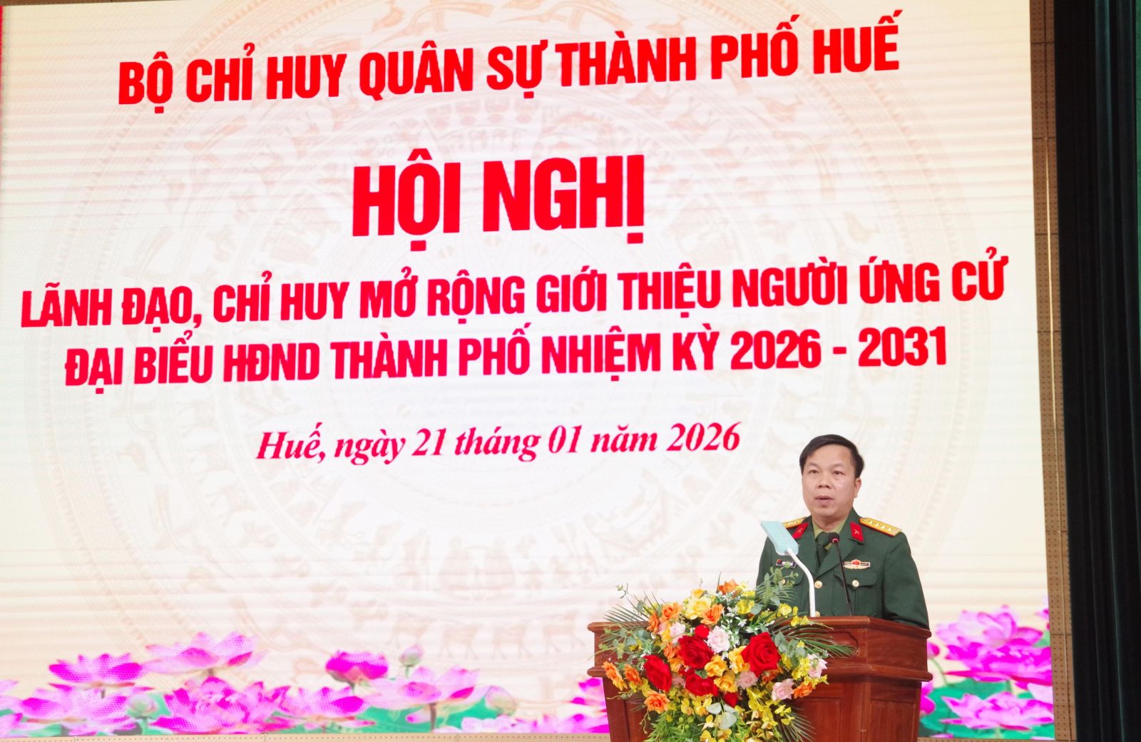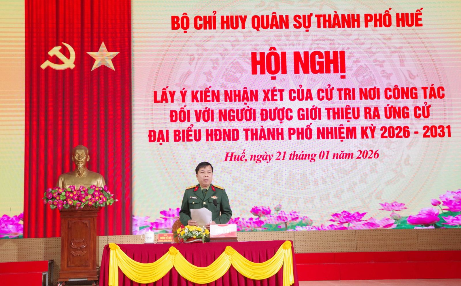 Sáng ngày 21/01, Bộ Chỉ huy Quân sự (CHQS) thành phố tổ chức hội nghị lấy ý kiến cử tri nơi công tác đối với người được dự kiến giới thiệu ứng cử đại biểu HĐND thành phố khóa IX, nhiệm kỳ 2026-2031 và hội nghị lãnh đạo, chỉ huy mở rộng giới thiệu người ứng cử đại biểu HĐND thành phố. Đại tá Trương Viết Hải, Thành ủy viên, Phó Bí thư Thường trực Đảng ủy, Chính ủy chủ trì hội nghị. Tham dự có các đồng chí trong Ban Thường vụ Đảng ủy, Thủ trưởng Bộ CHQS thành phố, Thủ trưởng các phòng, ban, các đơn vị và cán bộ sĩ quan, quân nhân chuyên nghiệp khối cơ quan Bộ CHQS thành phố.