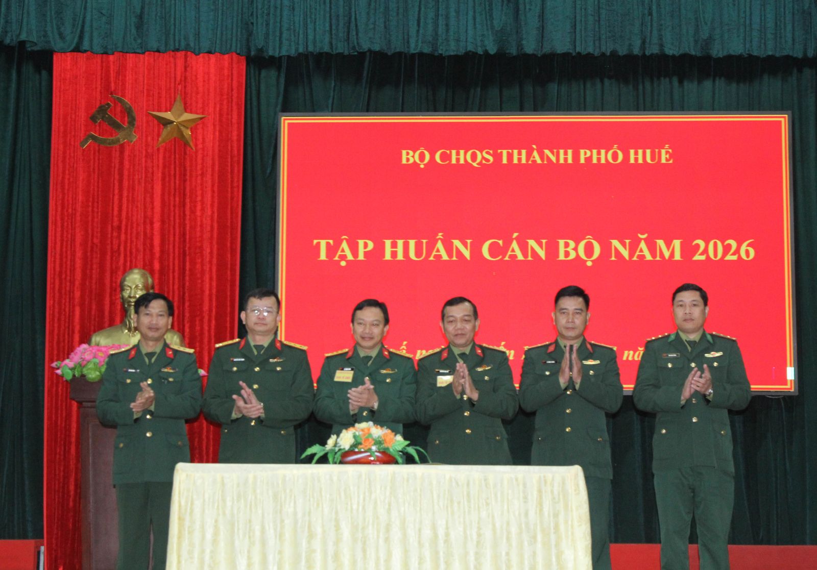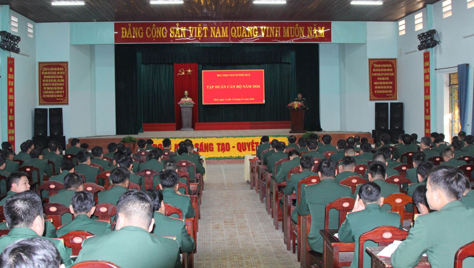 Sáng 13/01, Bộ chỉ huy quân sự thành phố Huế tổ chức khai mạc lớp tập huấn cán bộ năm 2026 cho 168 đồng chí là cán bộ chủ chốt thuộc Cơ quan Bộ chỉ huy, Ban chỉ huy Bộ đội Biên phòng, Ban chỉ huy phòng thủ các khu vực, các đơn vị trực thuộc và những đồng chí dự kiến được bổ nhiệm chức danh chỉ huy tại Ban chỉ huy quân sự 40 xã, phường. Đại tá Phan Thắng – UVTV thành ủy, Chỉ huy trưởng Bộ CHQS thành phố phát biểu chỉ đạo tại buổi khai mạc, tham dự khai mạc có Đại tá Trương Viết Hải - Thành uỷ viên, Chính uỷ Bộ CHQS thành phố.