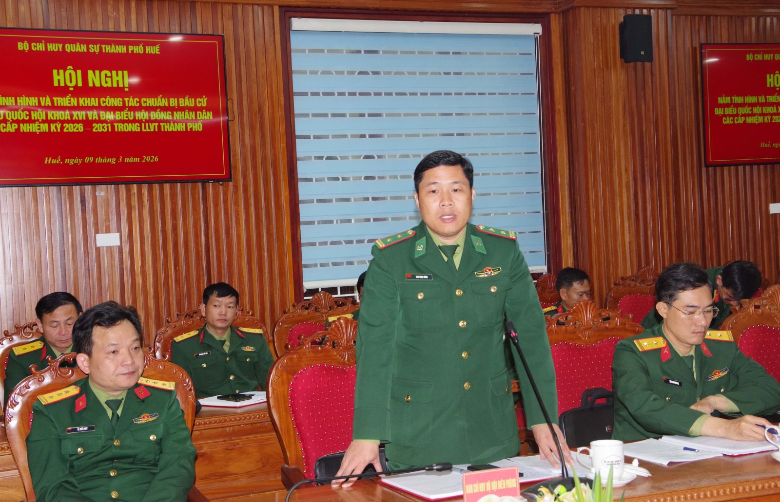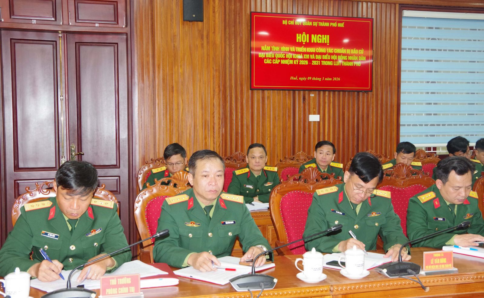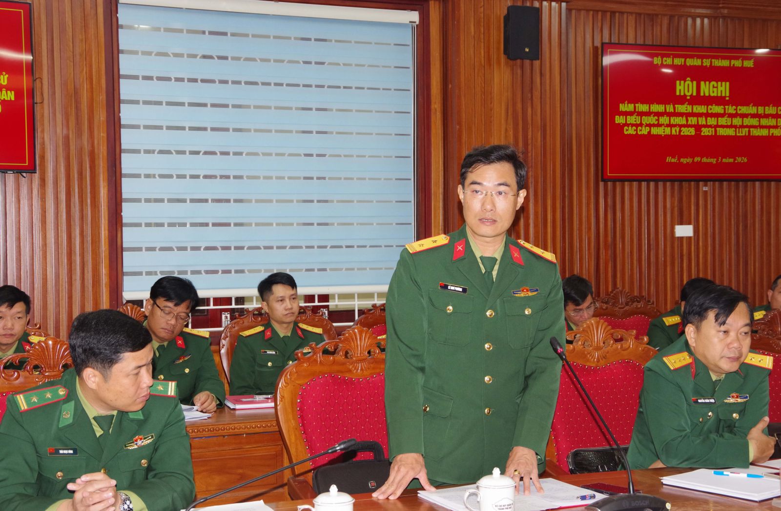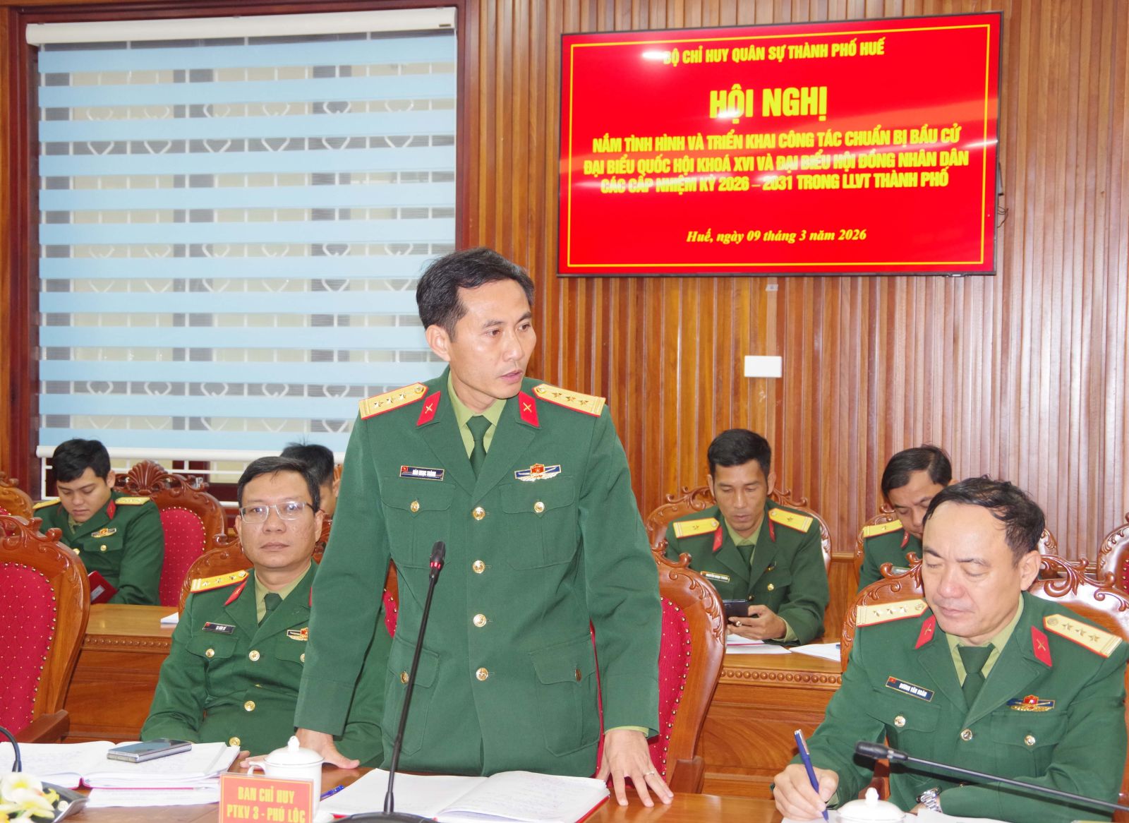 Sáng ngày 09/3, Bộ CHQS thành phố Huế tổ chức hội nghị nắm tình hình và triển khai công tác bầu cử đại biểu Quốc hội và đại biểu HĐND thành phố nhiệm kỳ 2026 – 2031 trong Lực lượng vũ trang Thành phố. Đại tá Hà Văn Ái – Phó Chính uỷ Bộ CHQS thành phố chủ trì hội nghị.