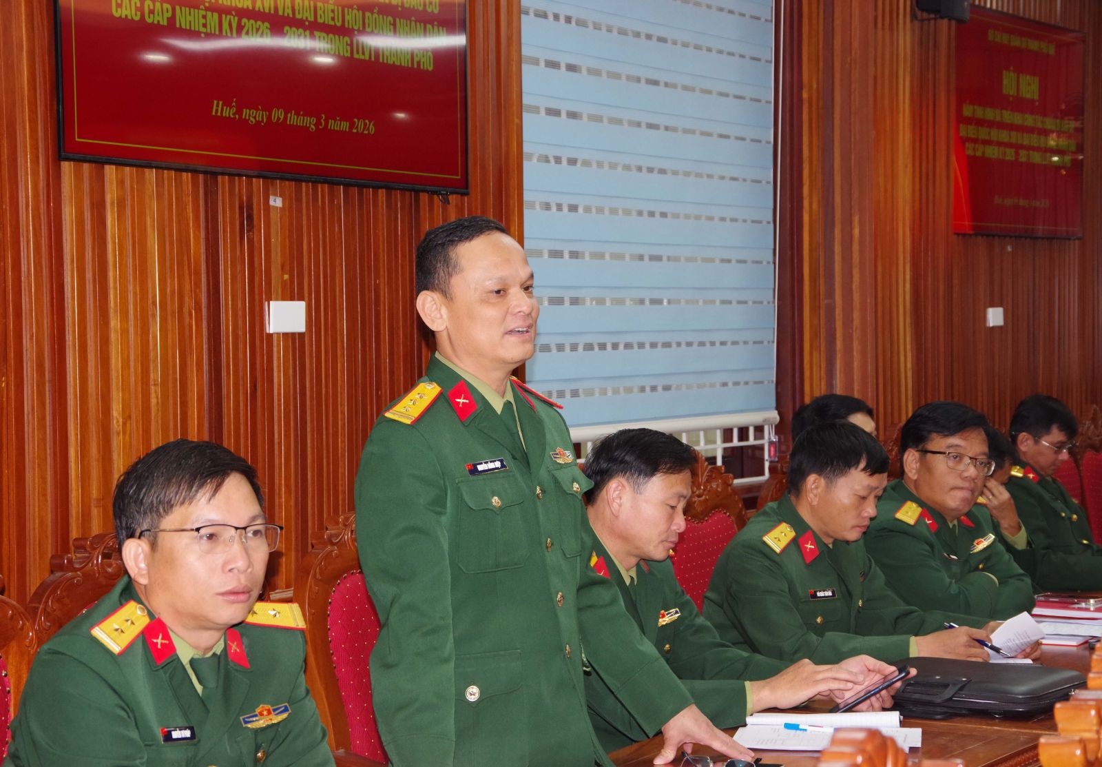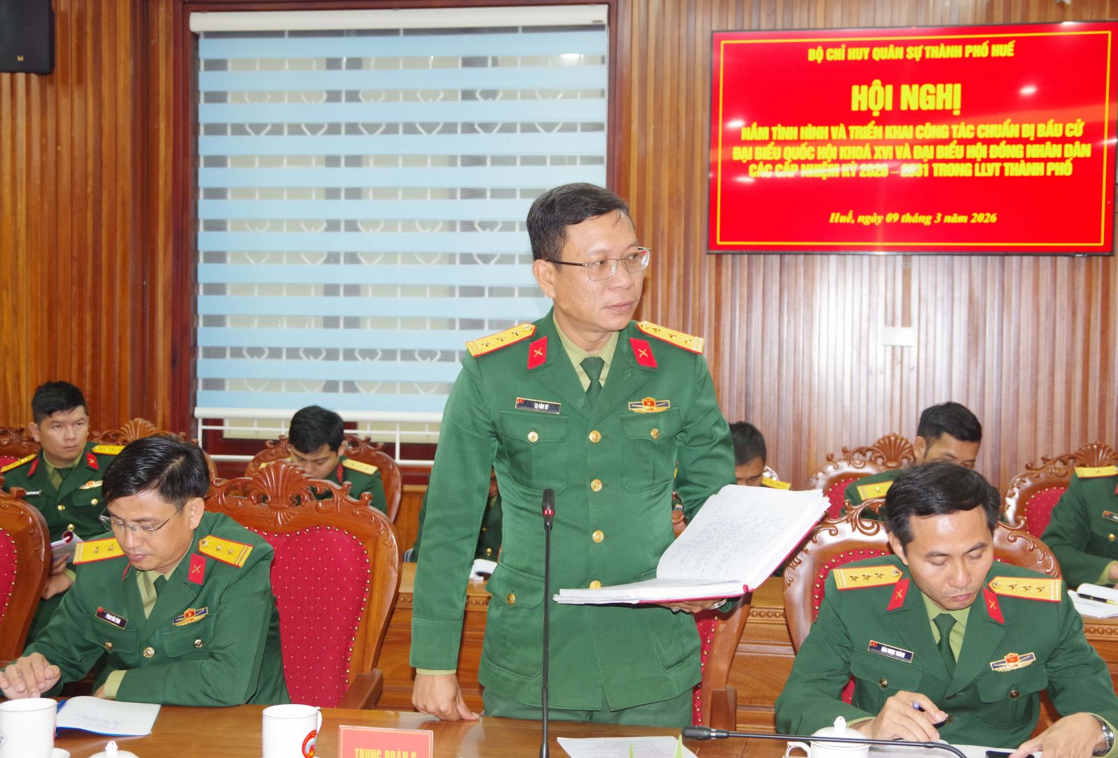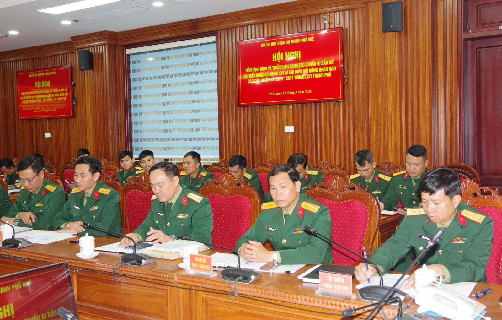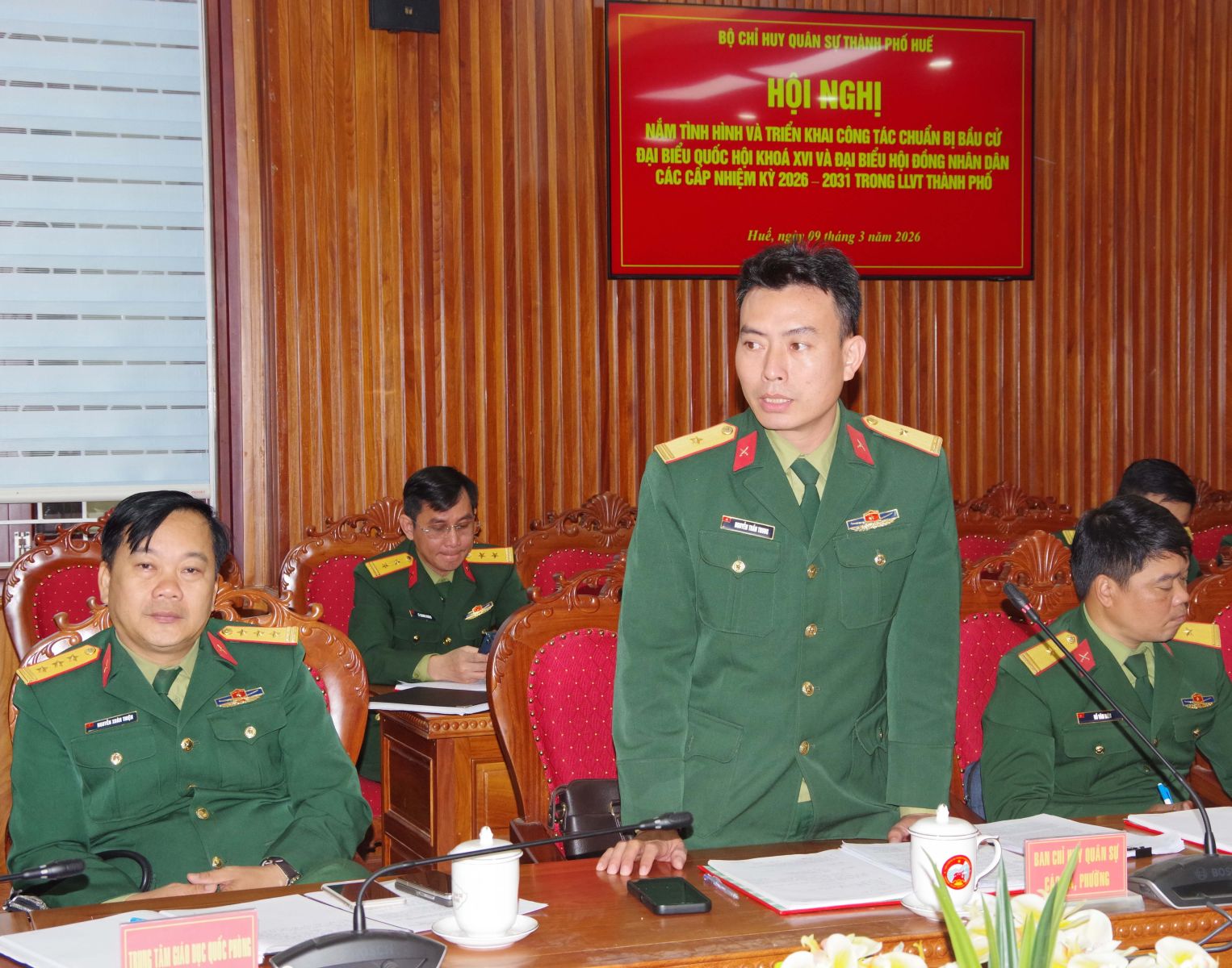 Sáng ngày 09/3, Bộ CHQS thành phố Huế tổ chức hội nghị nắm tình hình và triển khai công tác bầu cử đại biểu Quốc hội và đại biểu HĐND thành phố nhiệm kỳ 2026 – 2031 trong Lực lượng vũ trang Thành phố. Đại tá Hà Văn Ái – Phó Chính uỷ Bộ CHQS thành phố chủ trì hội nghị.