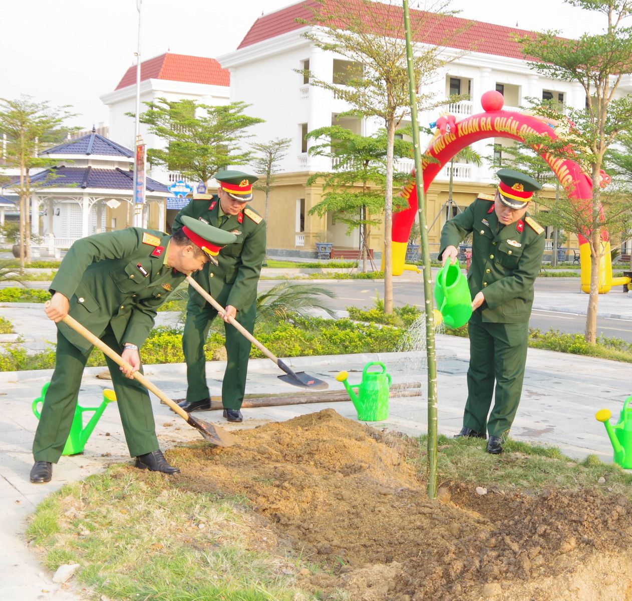 Cán bộ, chiến sĩ tiến hành trồng cây quanh doanh trại cơ qua Bộ chỉ huy quân sự thành phố