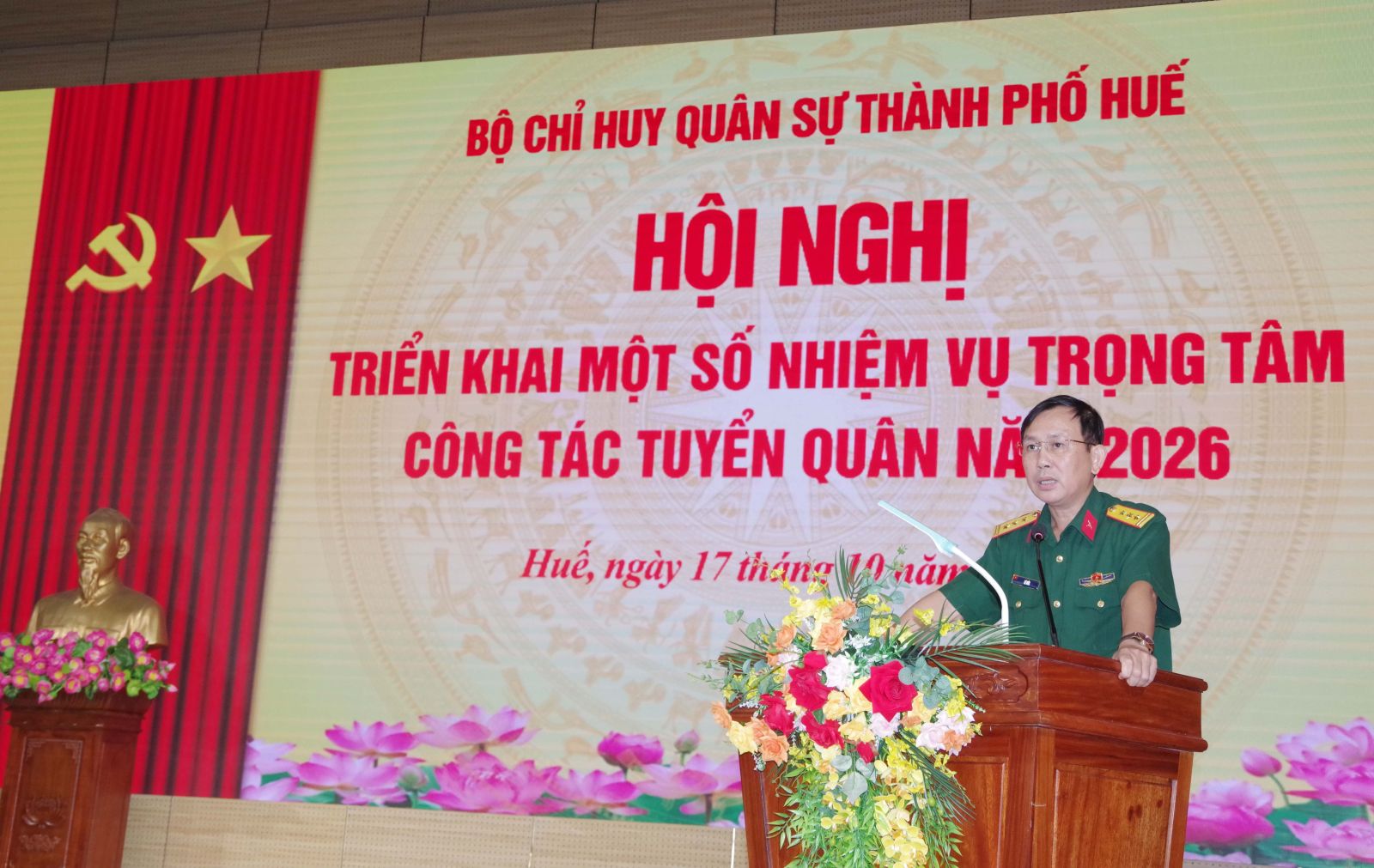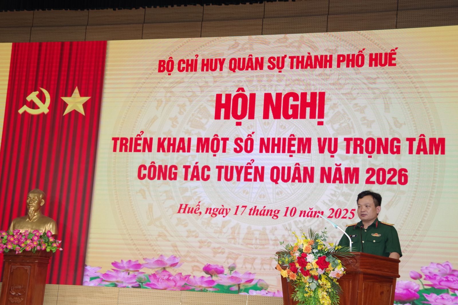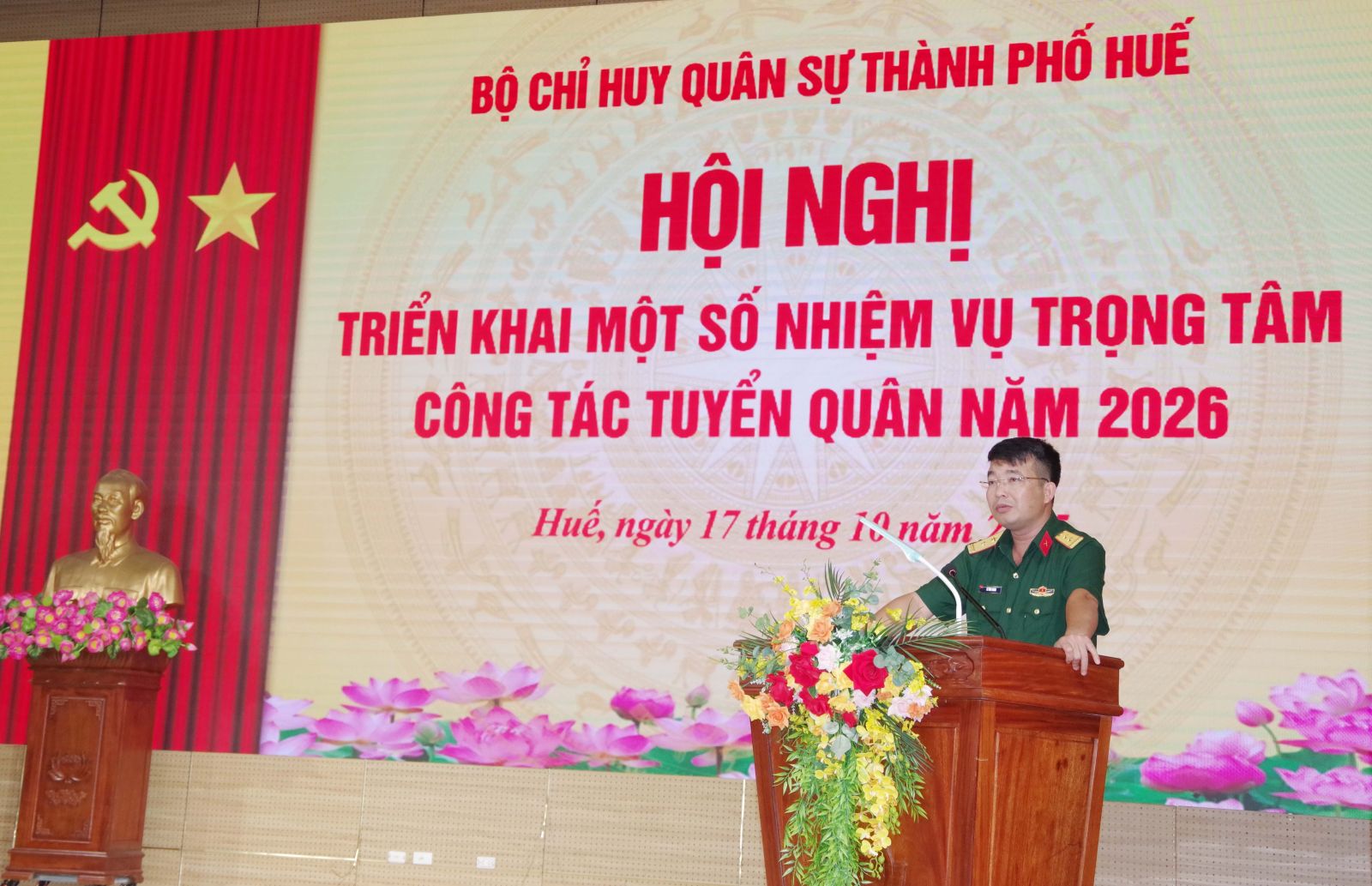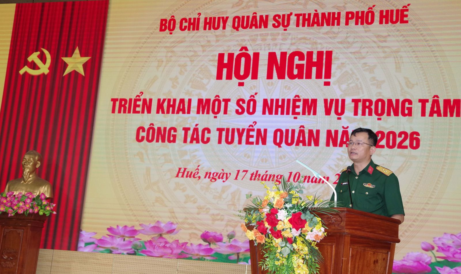 Để triển khai thực hiện hiệu quả công tác tuyển chọn và gọi công dân nhập ngũ năm 2026. Sáng ngày 17/10, Bộ CHQS thành phố Huế tổ chức hội nghị triển khai một số nhiệm vụ trọng tâm công tác tuyển quân năm 2026. Đại tá Lê Huy Nghĩa – Phó Chỉ huy trưởng, Tham mưu trưởng Bộ CHQS thành phố, Phó chủ tịch Hội đồng nghĩa vụ quân sự thành phố chủ trì hội nghị.