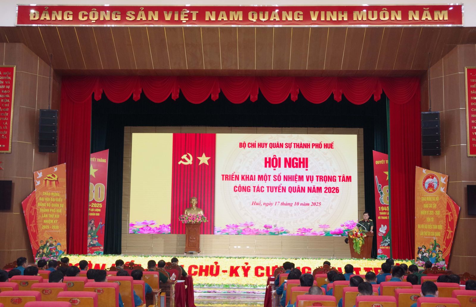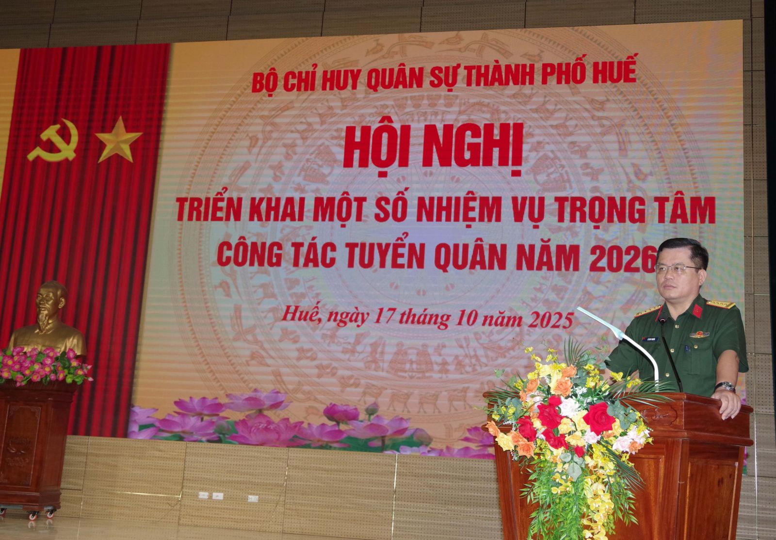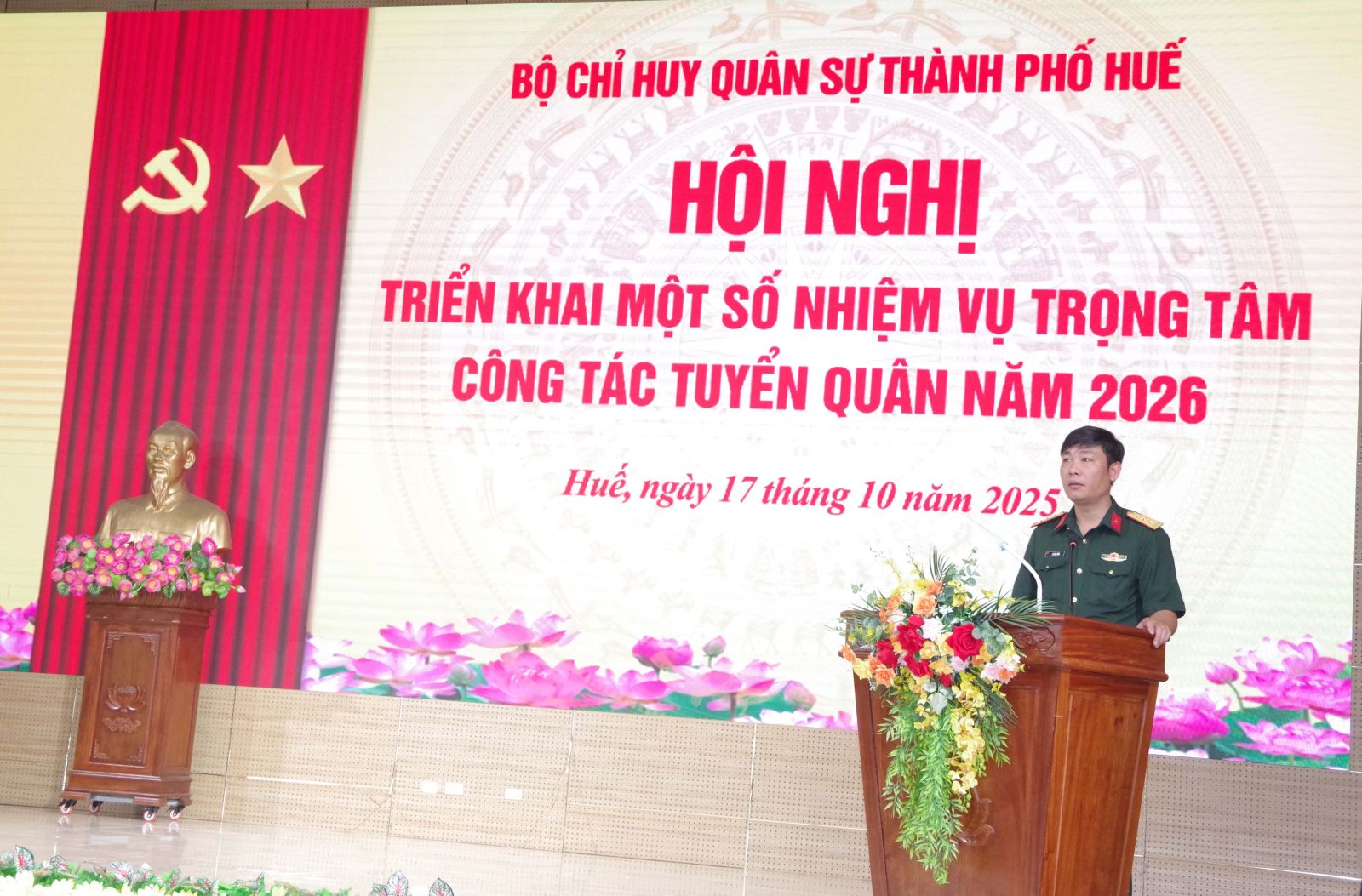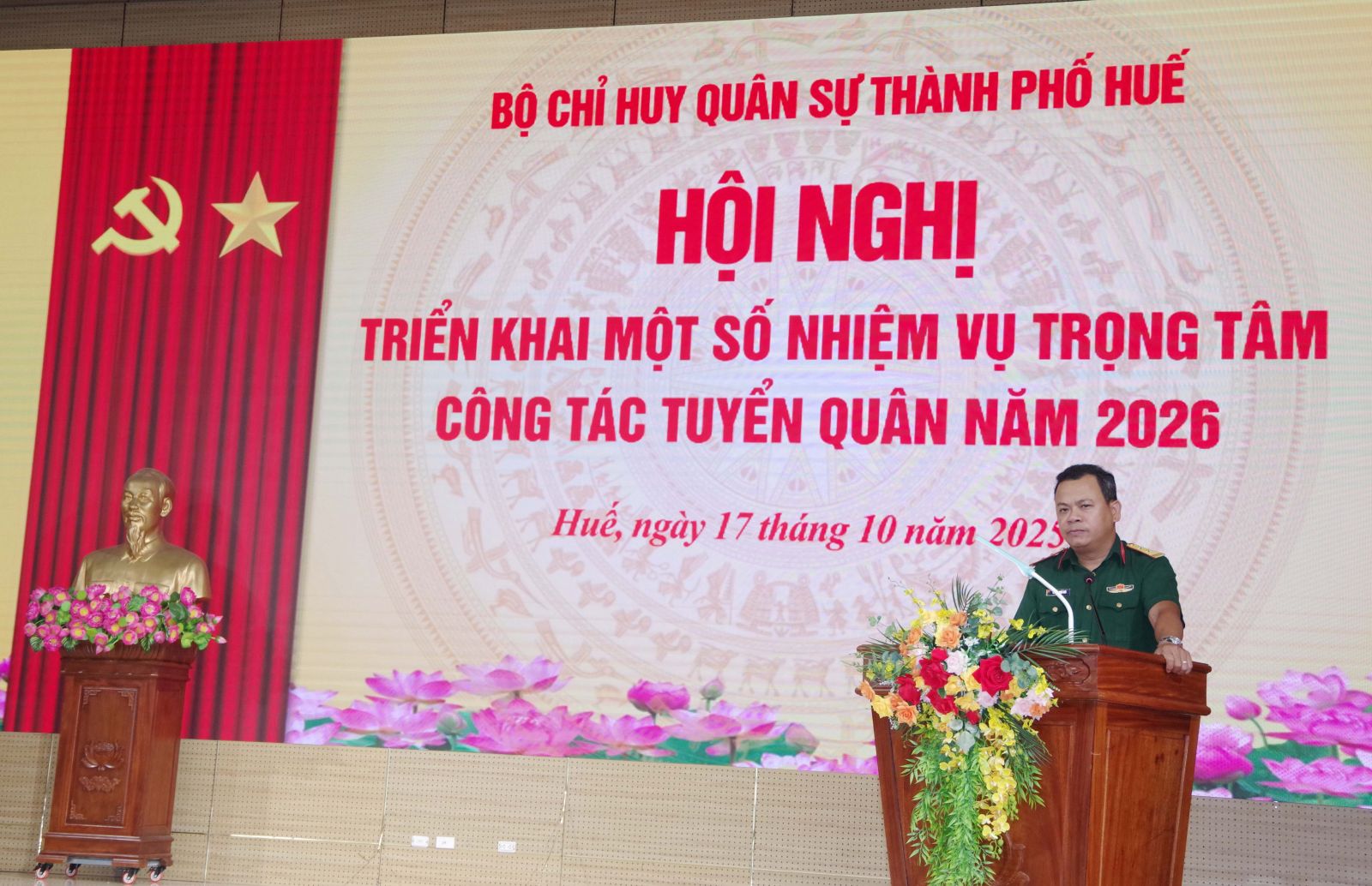 Để triển khai thực hiện hiệu quả công tác tuyển chọn và gọi công dân nhập ngũ năm 2026. Sáng ngày 17/10, Bộ CHQS thành phố Huế tổ chức hội nghị triển khai một số nhiệm vụ trọng tâm công tác tuyển quân năm 2026. Đại tá Lê Huy Nghĩa – Phó Chỉ huy trưởng, Tham mưu trưởng Bộ CHQS thành phố, Phó chủ tịch Hội đồng nghĩa vụ quân sự thành phố chủ trì hội nghị.