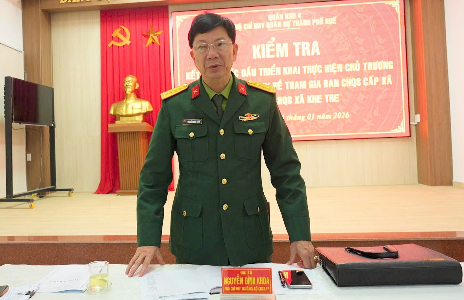 Sáng ngày 23/01, Đoàn công tác Bộ Chỉ huy Quân sự (CHQS) thành phố do Đại tá Nguyễn Đình Khoa - Phó Chỉ huy trưởng đã tiến hành kiểm tra công tác ổn định tổ chức biên chế những ngày đầu hoạt động tại Ban CHQS xã Khe Tre. Tham dự kiểm tra còn có lãnh đạo UBND cùng cán bộ, chiến sĩ Ban CHQS xã Khe Tre.