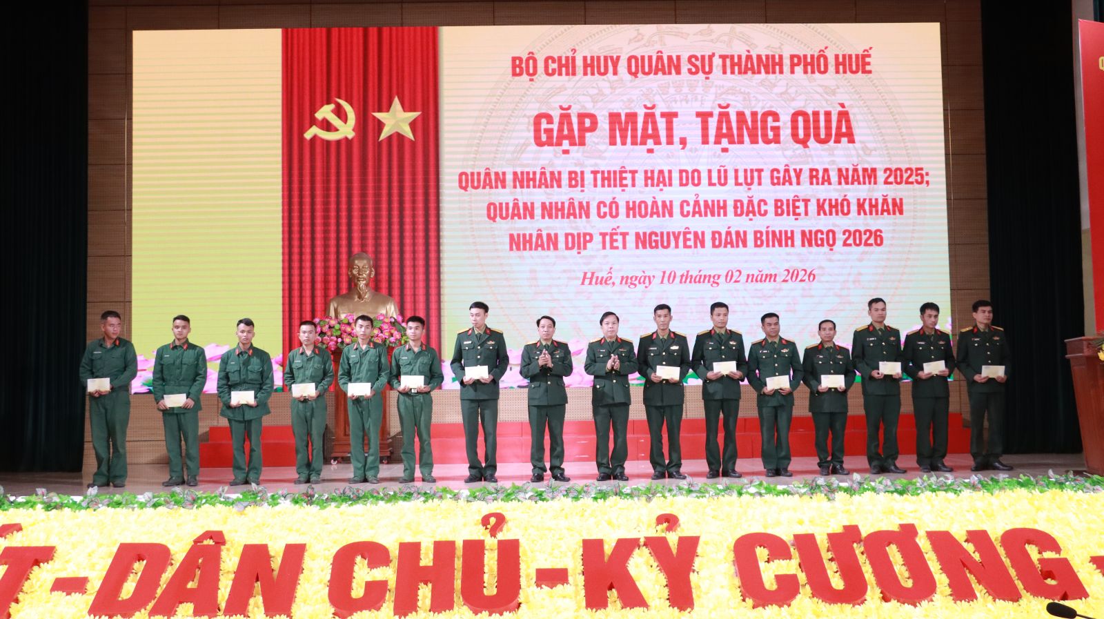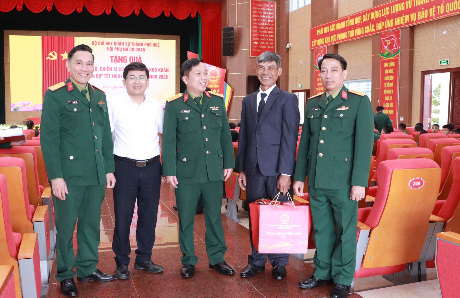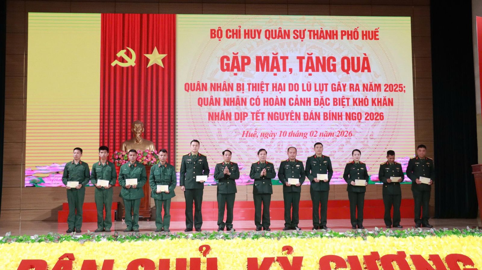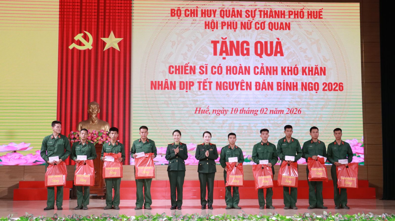 Cũng trong sáng nay, thừa ủy quyền, Bộ CHQS thành phố tổ chức tặng 38 suất quà của Bộ Quốc phòng, Bộ tư lệnh Quân khu 4 và Bộ CHQS thành phố cho các đồng chí cán bộ sĩ quan, QNCN, hạ sĩ quan – chiến sĩ đang công tác tại các cơ quan, đơn vị lực lượng vũ trang thành phố có hoàn cảnh gia đình đặc biệt khó khăn, mắc bệnh hiểm nghèo điều trị dài ngày và tặng 131 suất quà cho các quân nhân có gia đình bị thiệt hại do bão, lụt gây ra năm 2025. Hội Phụ nữ cơ quan Bộ CHQS thành phố cũng đã trao 9 suất quà tặng các đồng chí chiến sĩ có hoàn cảnh khó khăn./.