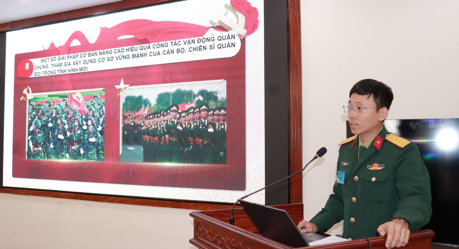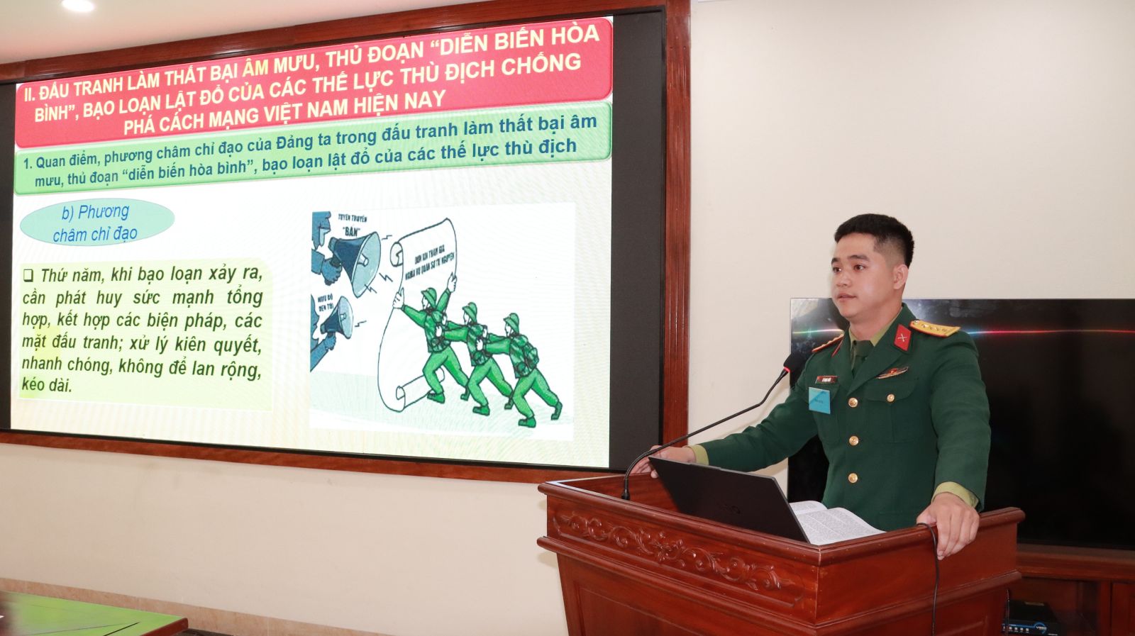Tham gia Hội thi thao giảng chính trị các thí sinh là chính trị viên, chính trị viên phó các đơn vị cơ sở trải qua các nội dung gồm soạn thảo bài giảng, thực hành giảng bài và trả lời các câu hỏi phụ do Ban Giám khảo đặt; phần giảng dạy, Ban Giám khảo yêu cầu tất cả thí sinh phải có bài giảng điện tử, trình chiếu power point...