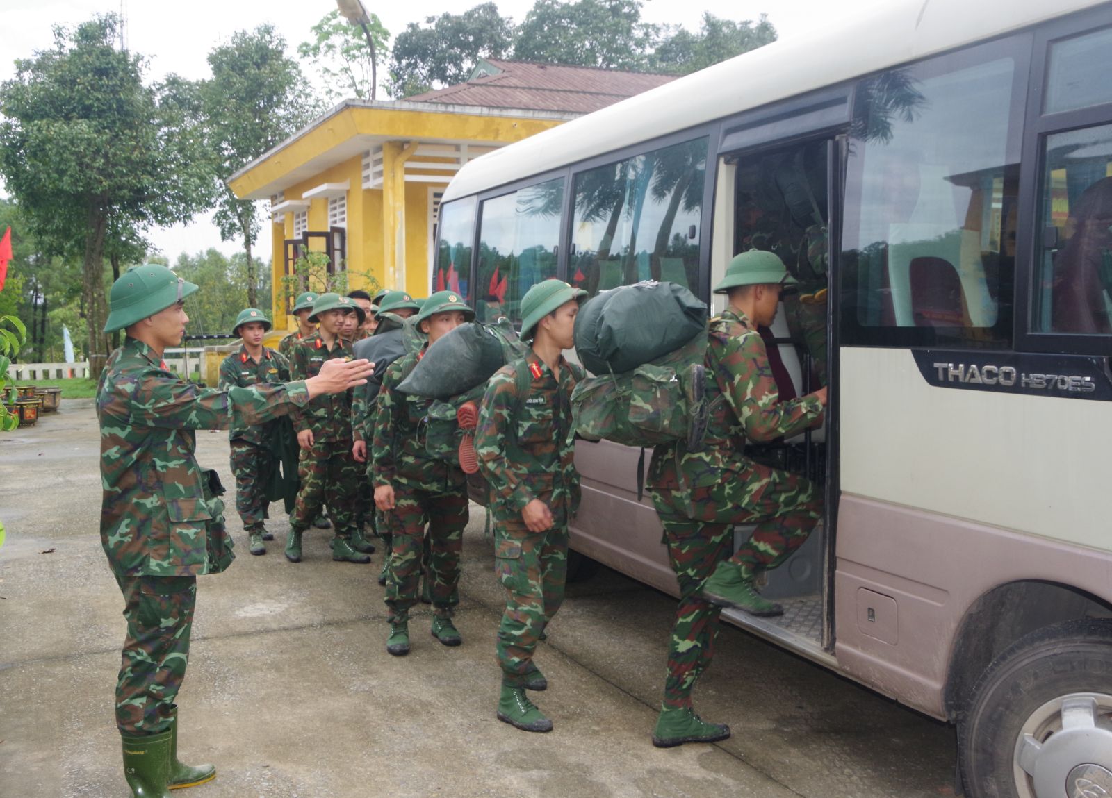 Cán bộ, chiến sĩ lên xe hành quân đến địa điểm dã ngoạn làm công tác dân vận.
