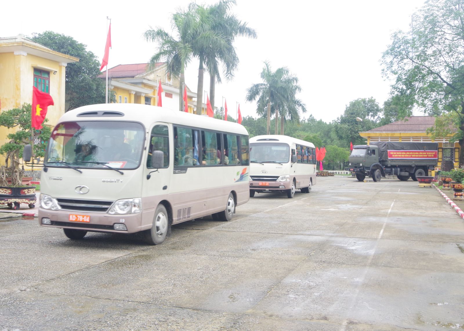 Cán bộ, chiến sĩ lên xe hành quân đến địa điểm dã ngoạn làm công tác dân vận