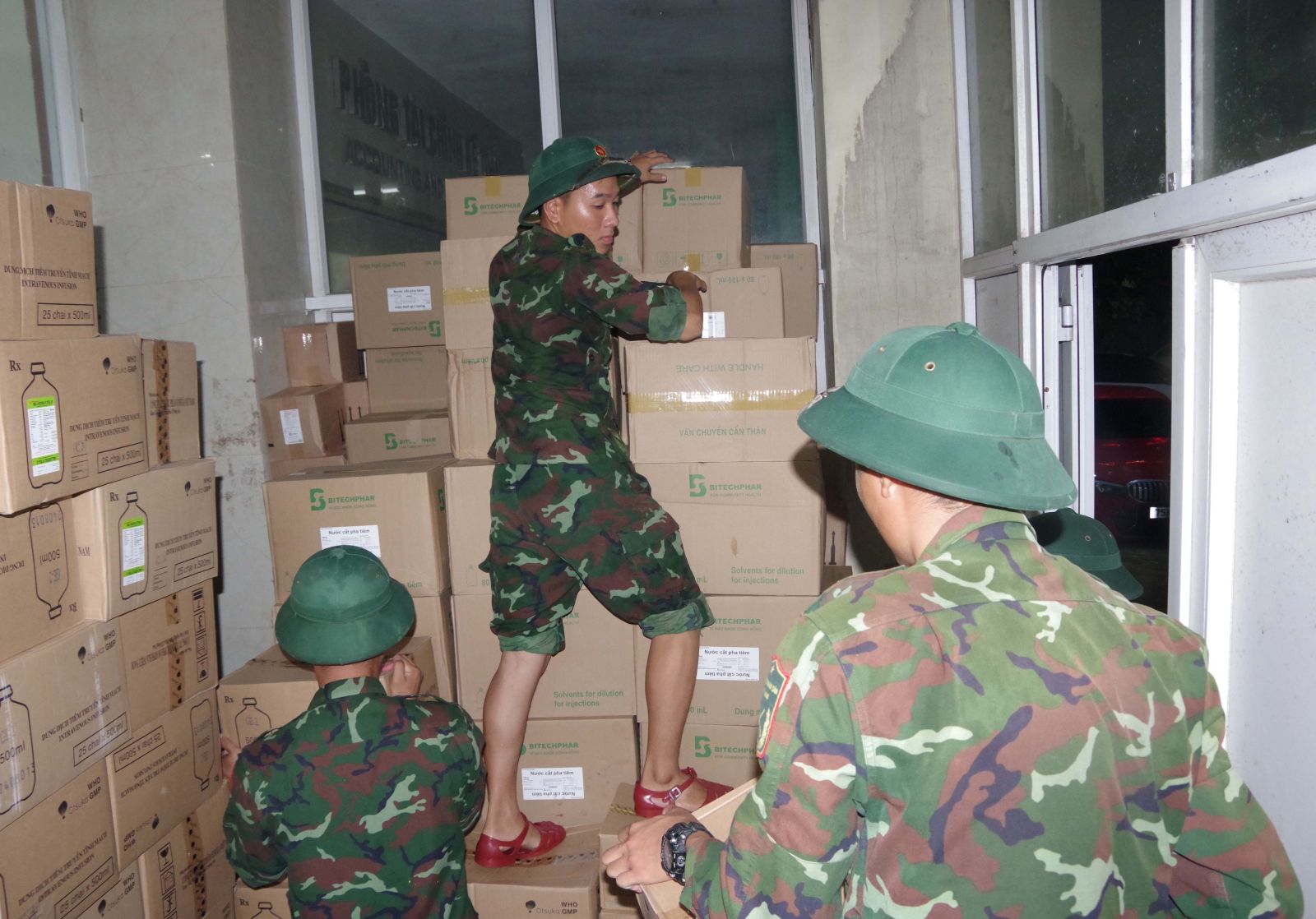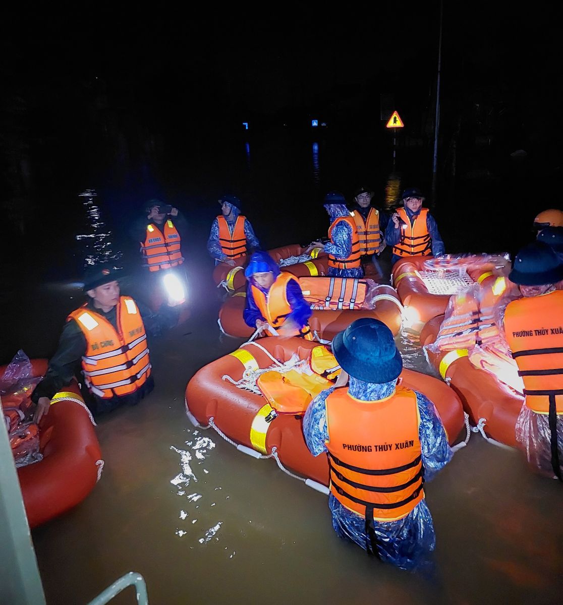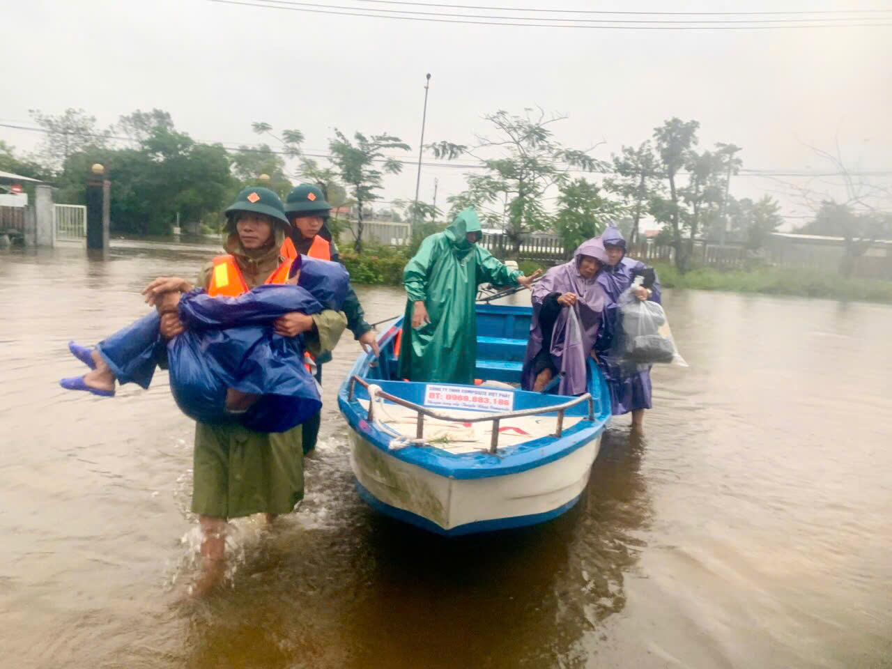 Mưa lớn và triều cường dâng cao đã tràn vào khuôn viên Bệnh viện Trung ương Huế làm phần lớn các khu vực thuộc tầng 1 có nguy cơ bị ngập sẽ làm ảnh hưởng nghiêm trọng đến công tác điều trị, an toàn tính mạng của bệnh nhân và hệ thống cơ sở vật chất, trang thiết bị của bệnh viện. Trước tình hình trên, ngay trong đêm Bộ CHQS thành phố Huế đã khẩn trương điều động hàng chục cán bộ, chiến sĩ có mặt kịp thời phối hợp với các lực lượng hỗ trợ các y, bác sỹ, nhân viên y tế ở các Khoa nhanh chóng di chuyển bệnh nhân và đồ dùng cá nhân từ tầng 1 lên các tầng cao hơn để đảm bảo an toàn. Bên cạnh đó, cán bộ, chiến sĩ cũng đã hỗ trợ các Khoa, Trung tâm của Bệnh viện bốc xếp, kê kích, đưa toàn bộ các trang thiết bị, hệ thống máy móc chuyên dụng lên các vị trí an toàn.