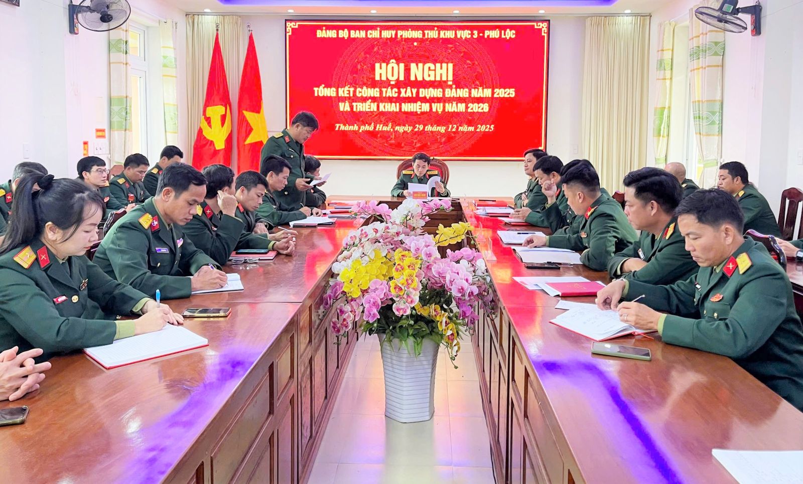 Tại hội nghị, Đảng uỷ, Ban Chỉ huy Phòng thủ khu vực 3 - Phú Lộc đã đánh giá toàn diện kết quả thực hiện công tác xây dựng đảng năm 2025. Trong năm qua, dưới sự lãnh đạo, chỉ đạo trực tiếp của Đảng ủy Quân sự thành phố và sự nỗ lực của toàn thể cán bộ, đảng viên, Đảng bộ đã tập trung lãnh đạo, chỉ đạo thực hiện có hiệu quả các nhiệm vụ chính trị trọng tâm. Công tác xây dựng Đảng về chính trị, tư tưởng, tổ chức và đạo đức tiếp tục được tăng cường; vai trò lãnh đạo, sức chiến đấu của tổ chức đảng, chất lượng đội ngũ cán bộ, đảng viên không ngừng được nâng cao. Hoàn thành tốt các chỉ tiêu, nghị quyết đề ra, góp phần xây dựng Đảng bộ trong sạch, vững mạnh, đơn vị vững mạnh toàn diện, Hoàn thành xuất sắc mọi nhiệm vụ được giao.