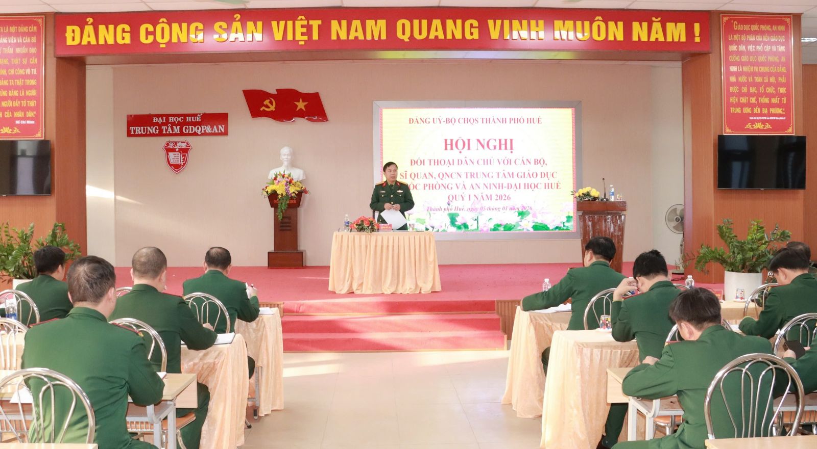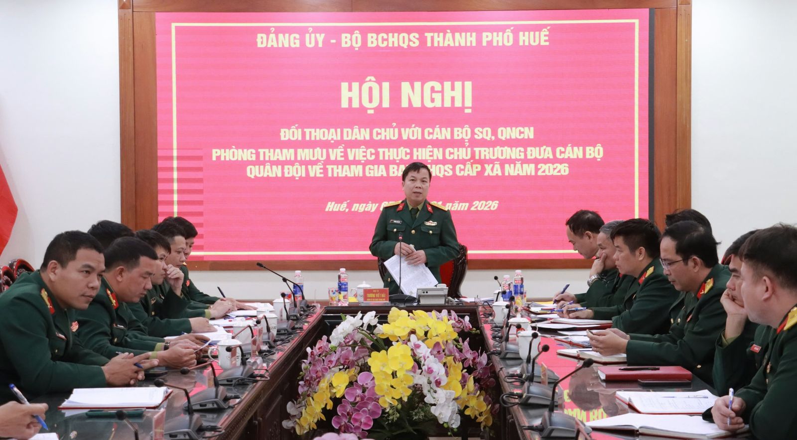Nhằm quán triệt chủ trương của Bộ chính trị, Quân uỷ Trung ương Bộ quốc phòng và nắm bắt tâm tư, nguyện vọng của cán bộ sĩ quan, quân nhân chuyên nghiệp về việc đưa cán bộ Quân đội về tham gia Ban CHQS cấp xã năm 2026. Ngày 05/01, Đảng uỷ - Bộ CHQS thành phố Huế đã tổ chức đối thoại dân chủ với cán bộ sĩ quan, quân nhân chuyên nghiệp của các cơ quan, đơn vị trực thuộc Bộ CHQS thành phố. Đại tá Phan Thắng - UVTV thành uỷ, Phó bí thư đảng uỷ, Chỉ huy trưởng, Đại tá Trương Viết Hải - Thành uỷ viên, Phó bí thư thường trực đảng uỷ, Chính uỷ cùng các đồng chí trong Ban thường vụ Đảng uỷ quân sự thành phố chủ trì hội nghị.