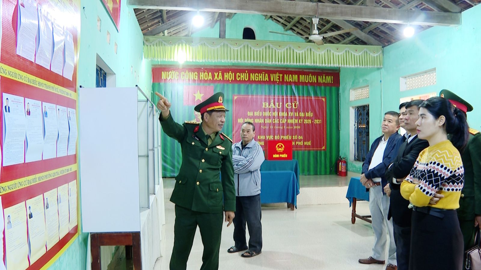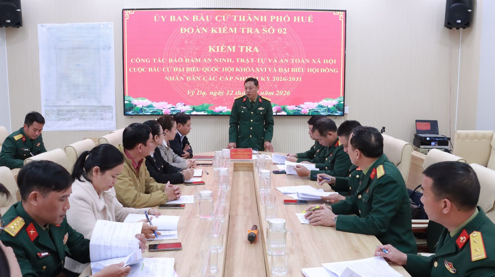 Thực hiện Kế hoạch số 15 ngày 12/01/2026 của Ủy ban bầu cử thành phố Huế, ngày 12/03, đoàn công tác số 2 Ủy ban bầu cử thành phố Huế do Đại tá Phan Thắng, Ủy viên Ban Thường vụ Thành ủy, Chỉ huy trưởng Bộ Chỉ huy Quân sự (CHQS) thành phố, Ủy viên Ủy ban bầu cử thành phố làm trưởng đoàn đã đến kiểm tra công tác bảo đảm an ninh, trật tự và an toàn xã hội cuộc bầu cử đại biểu Quốc hội khóa XVI và bầu cử đại biểu Hội đồng nhân dân các cấp, nhiệm kỳ 2026 – 2031 tại phường Kim Trà, Hương Trà, Phong Điền, Phú Xuân và Vỹ Dạ.