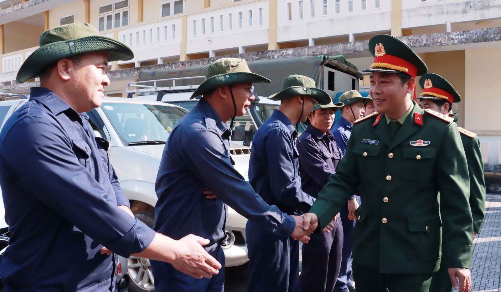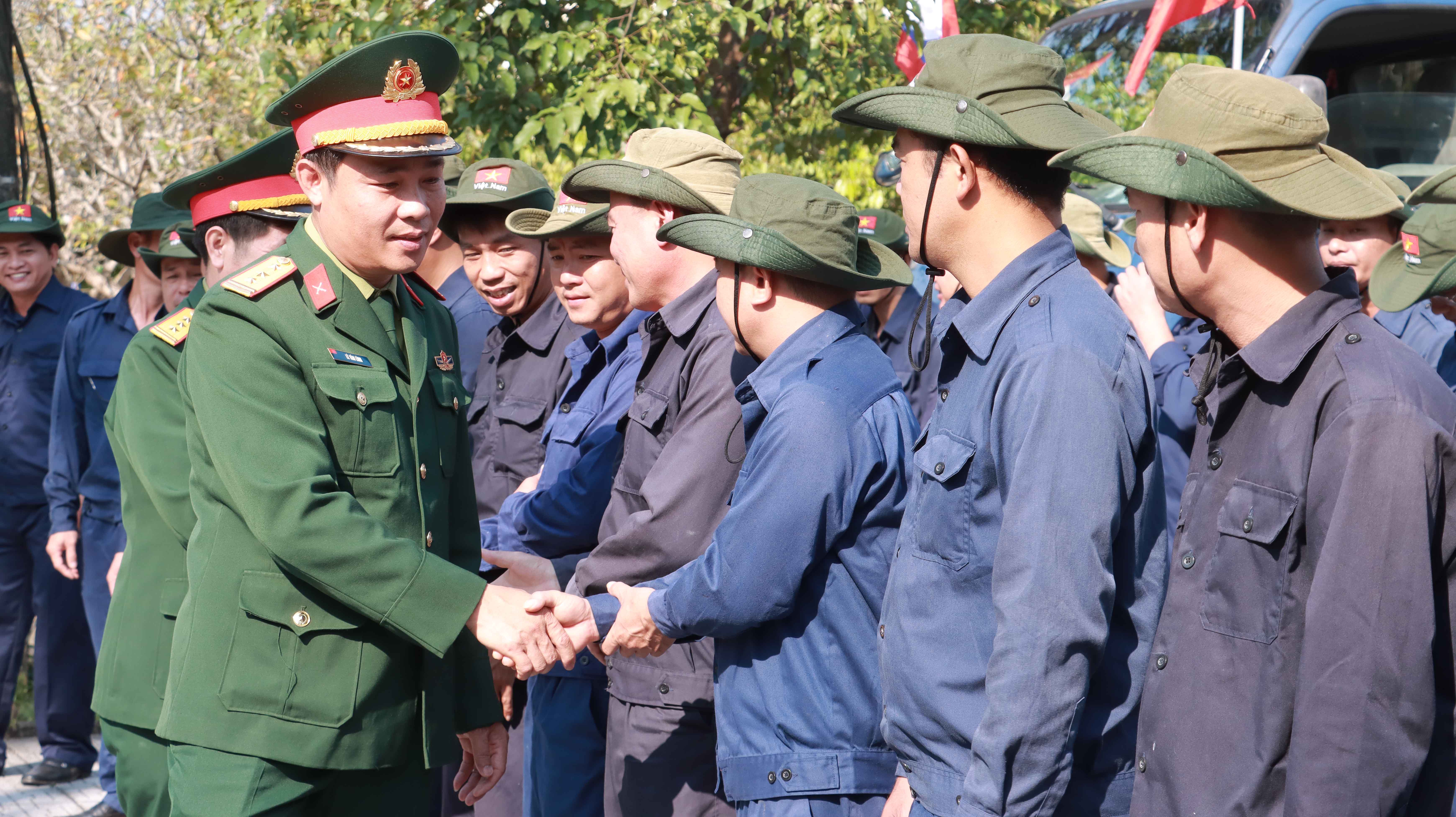 Thượng tá Lê Văn Lĩnh - Chủ nhiệm chính trị Bộ CHQS thành phố bắt tay động viên cán bộ, nhân viên Đội 192 lên đường làm nhiệm vụ tại Lào