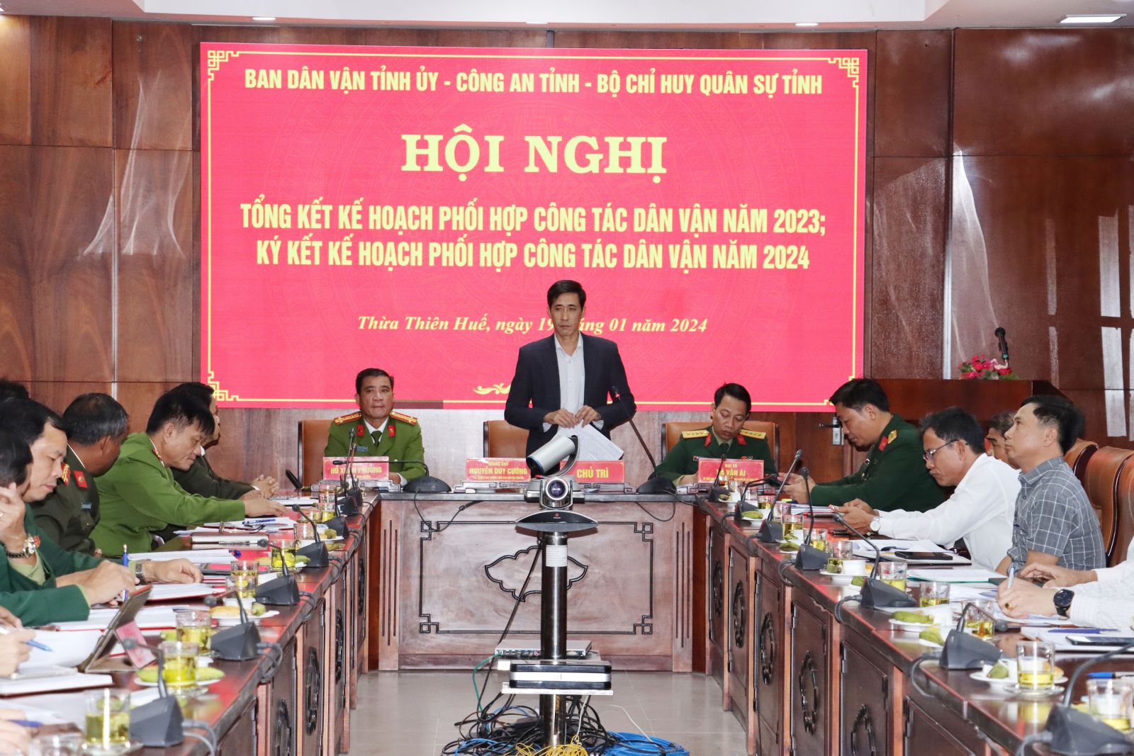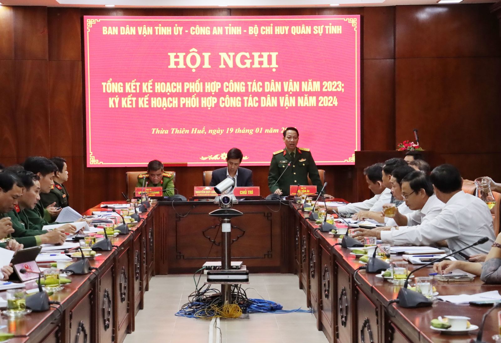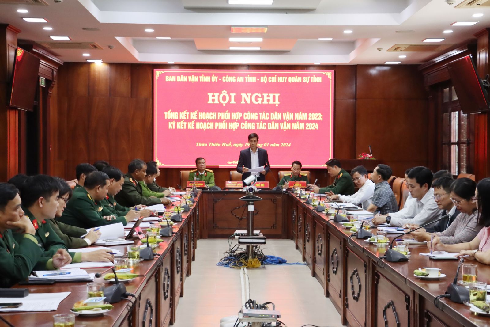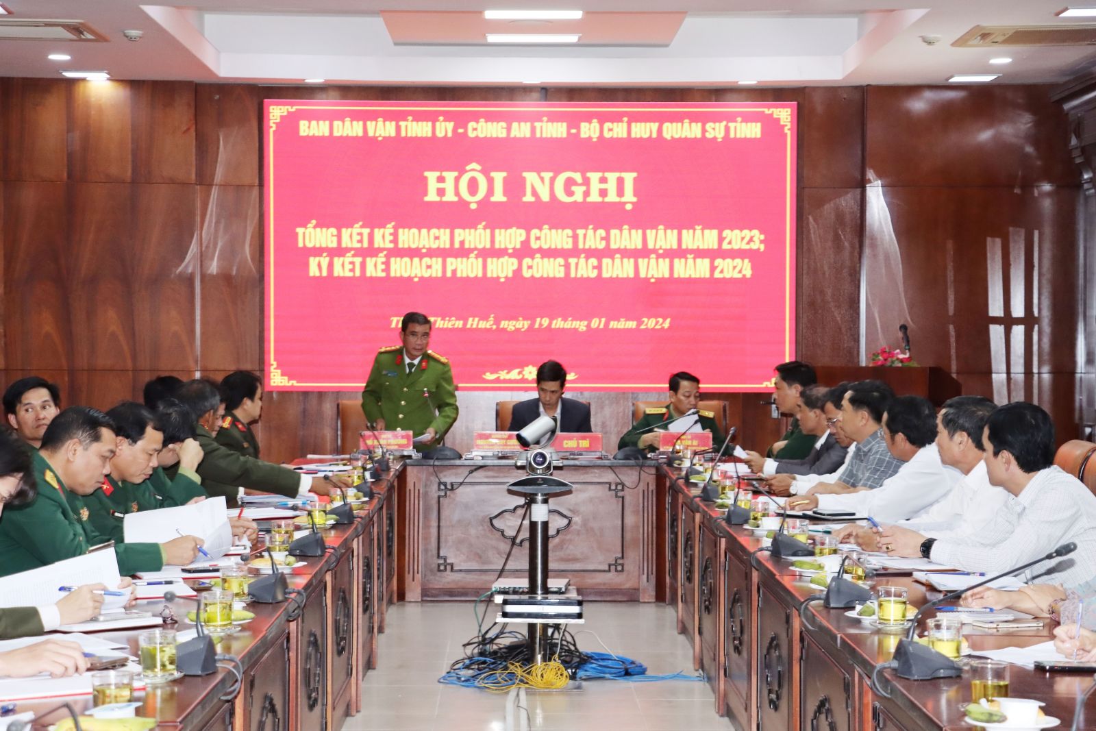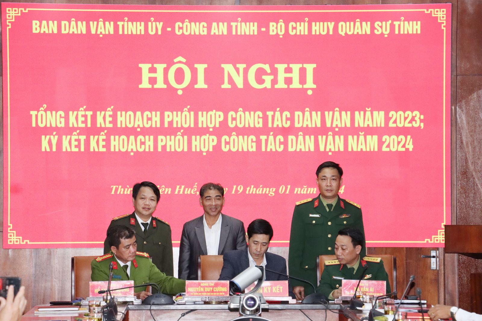 Chiều ngày 19/1/2024, Ban Dân vận Tỉnh ủy, Công an tỉnh, Bộ Chỉ huy Quân sự tỉnh Thừa Thiên Huế tổ chức hội nghị ký kết Chương trình phối hợp công tác dân vận năm 2024. Dự hội nghị có đồng chí Nguyễn Duy Cường, Phó Trưởng Ban Thường trực Ban Dân vận Tỉnh ủy; Đại tá Hà Văn Ái, Phó Chính ủy Bộ Chỉ huy Quân sự tỉnh; Đại tá Hồ Xuân Phương – Phó Giám đốc Công an tỉnh đồng chủ trì hội nghị.