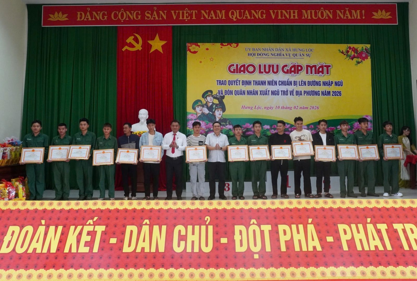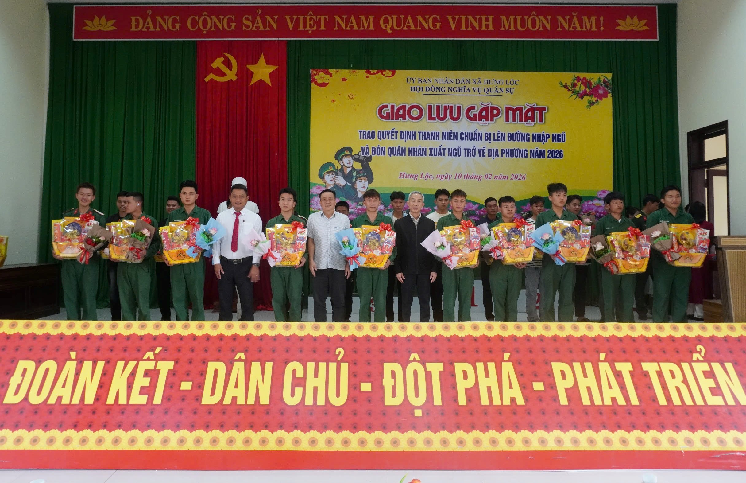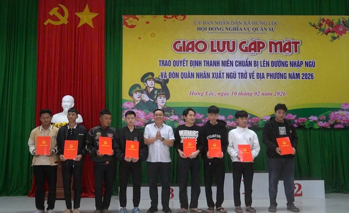 Sáng 10/2, Hội đồng Nghĩa vụ quân sự xã Hưng Lộc tổ chức buổi gặp mặt đón tiếp các quân nhân hoàn thành nghĩa vụ trở về địa phương và trao quyết định cho những thanh niên ưu tú lên đường nhập ngũ năm 2026. Tham dự buổi gặp mặt có các đồng chí trong Thường trực Đảng ủy, HĐND, UBND, UBMTTQ Việt Nam xã, cùng các quân nhân xuất ngũ và tân binh sắp lên đường.